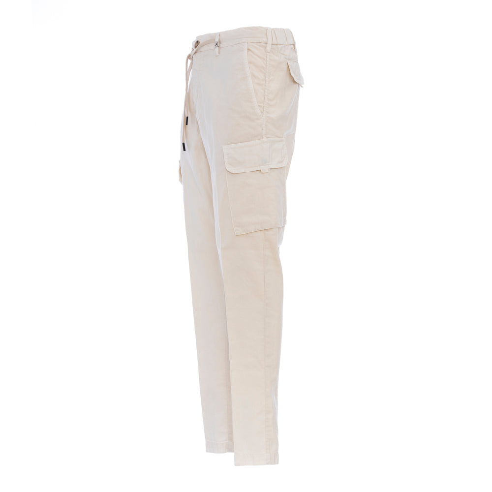 Pantalone con due tasche americane frontali, due laterali cargo e due con pattina e bottone a pressione nascosto, chiusura a zip e bottone e coulisse in vita regolabile.