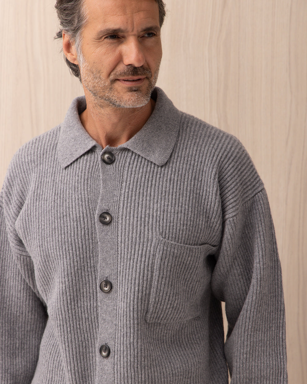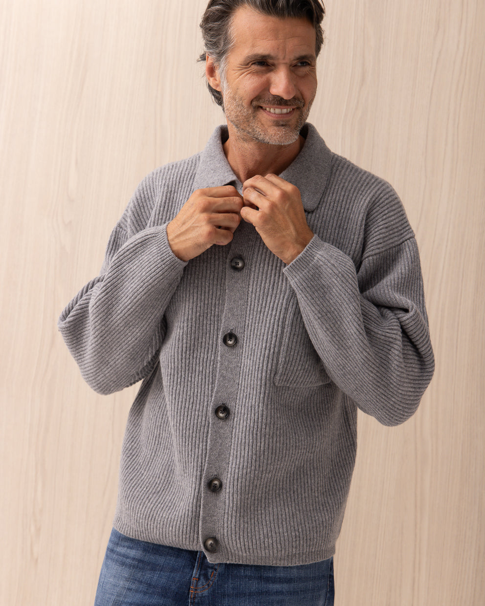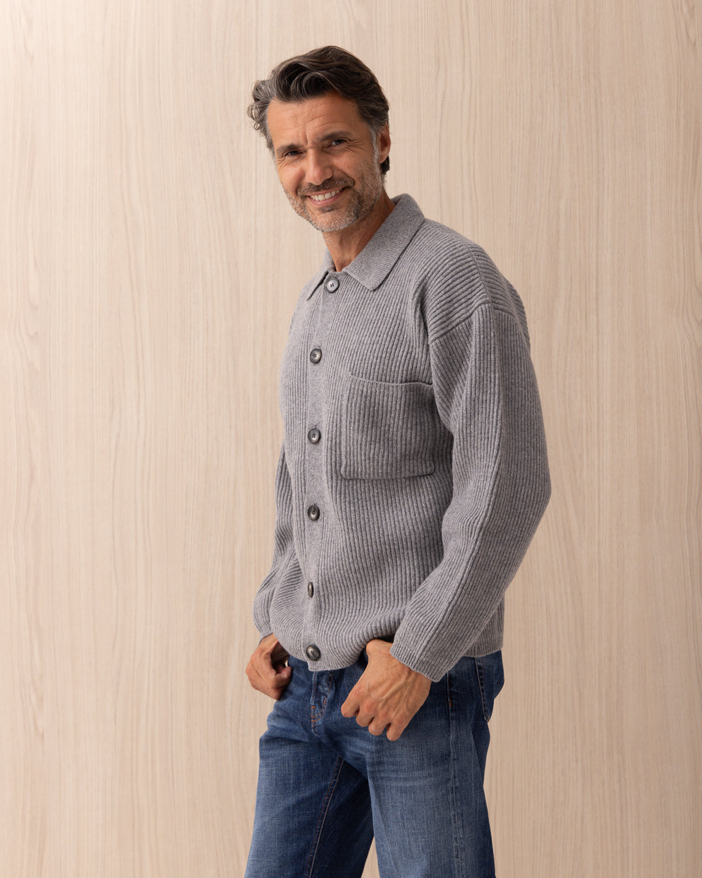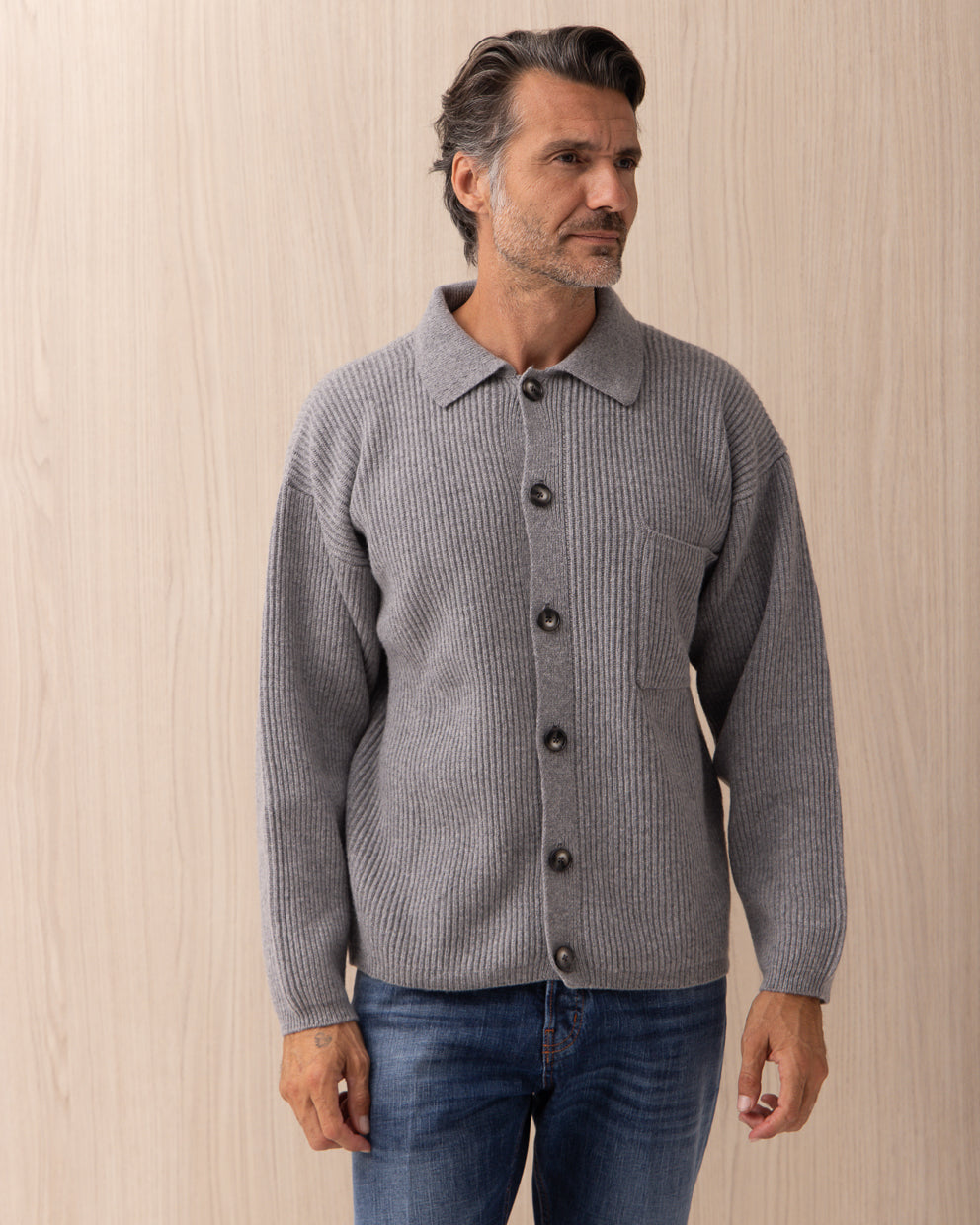 Scopri l'eleganza discreta del cardigan AMARANTO in un raffinato colore alluminio. Realizzato con una pregiata miscela di lana e cachemire, questo capo offre una consistenza irresistibile e un comfort senza pari. Il design classico arricchito dal colletto e dalla chiusura a bottoni lungo tutta la lunghezza si unisce a una trama a coste, esaltando la naturalezza e la versatilità del capo. L'aggiunta di una tasca applicata sul petto dona un tocco di sobria funzionalità. Perfetto per un fine settimana in città o un incontro formale, questo cardigan esprime un'eleganza senza tempo.- Vestibilità: Regular fit- Collezione: Autunno/Inverno 2026- Composizione: 90% Lana, 10% Cachemire- Colore: Grigio