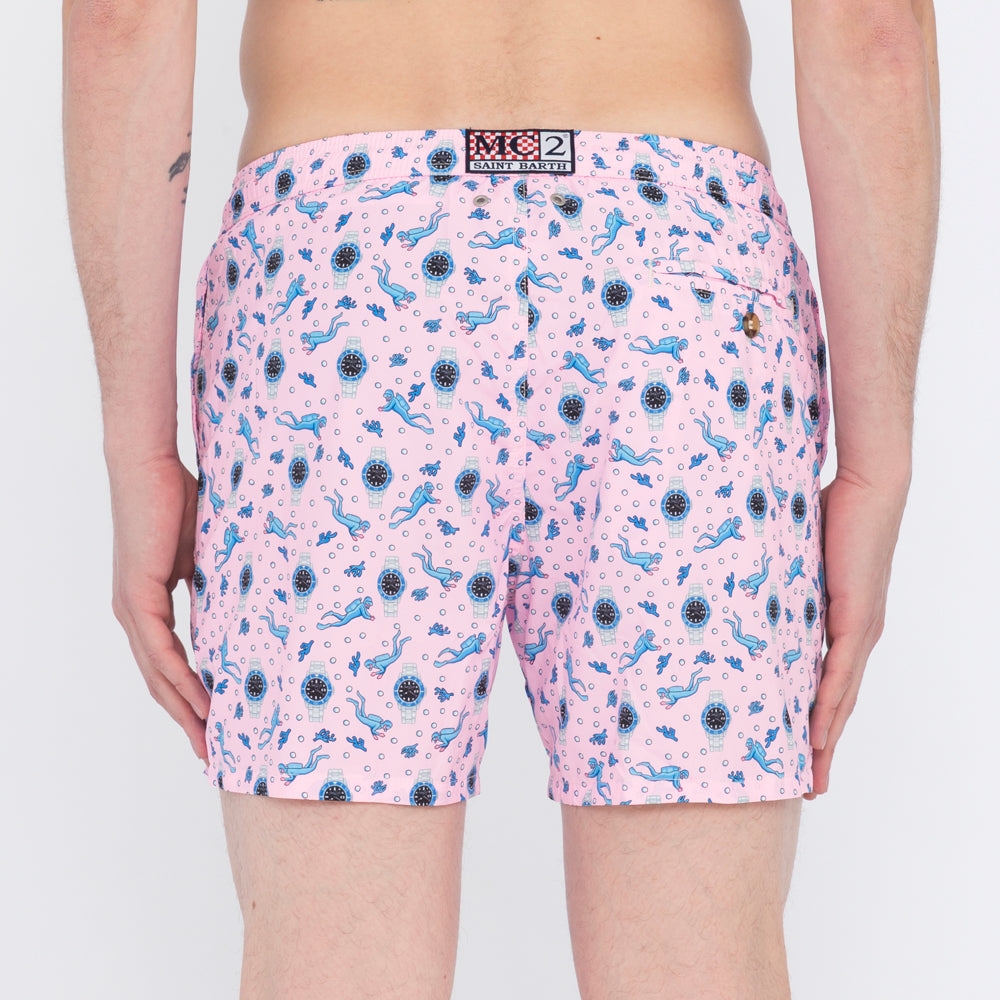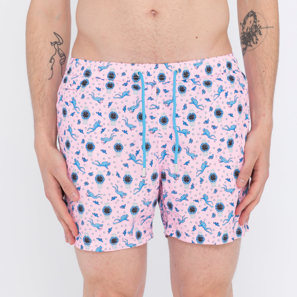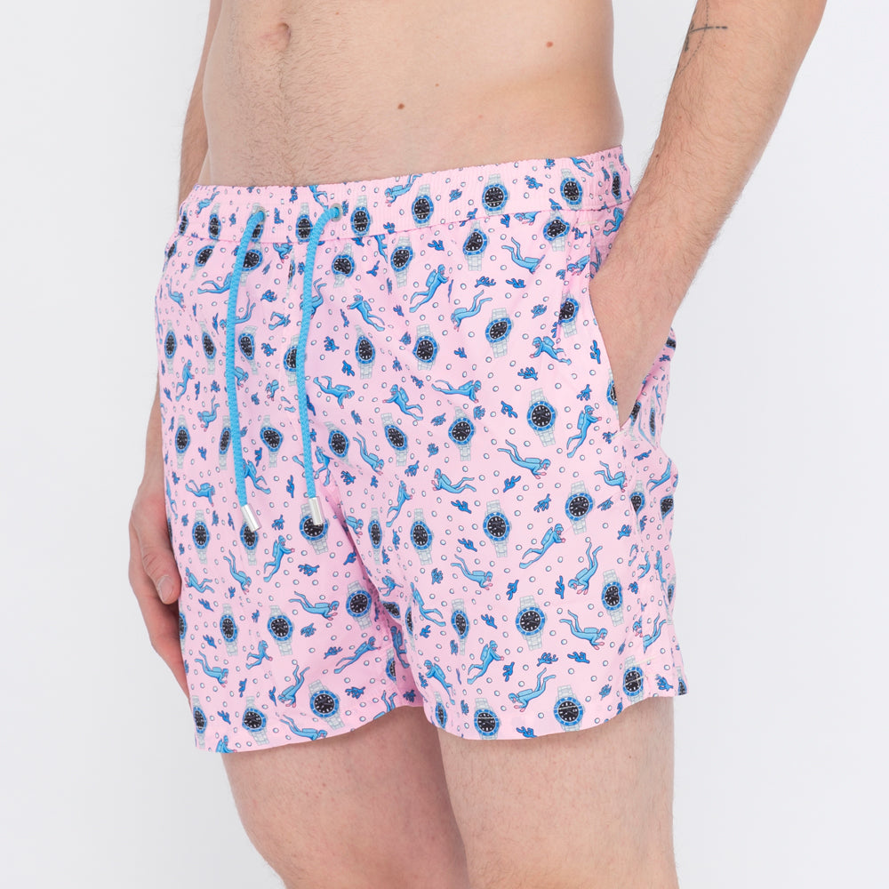 Boxer mare da uomo con stampa all over su fondo rosa. Lunghezza media. Fodera in rete leggera. Elastico in vita. Chiusura con coulisse. Tasche anteriori e posteriori.