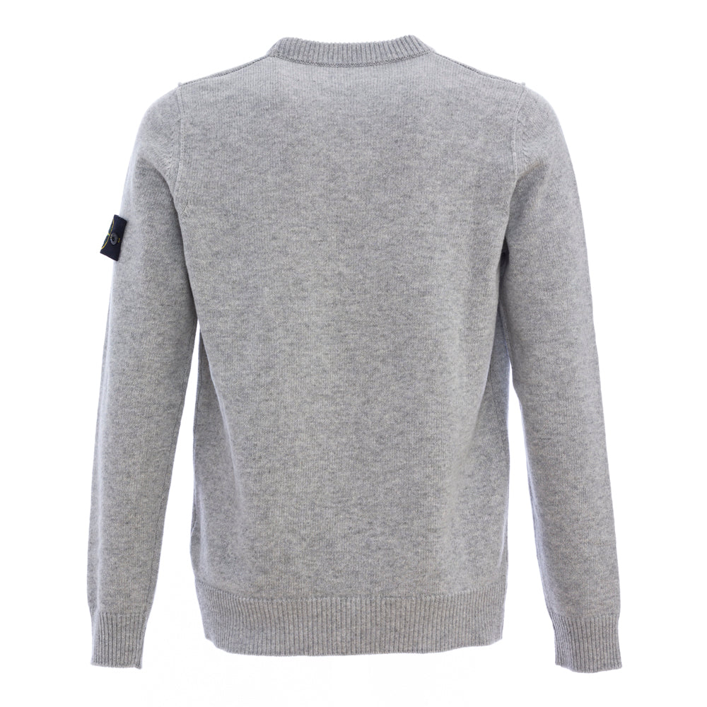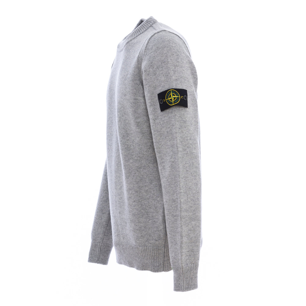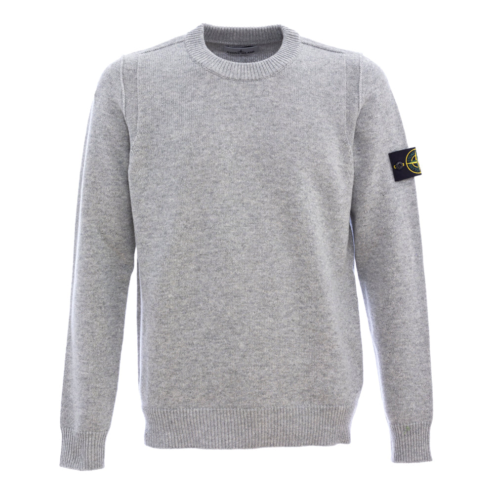 Rundhalspullover aus Lammwolle, glatt gestrickt, 7 Gauge, gerippter Halsausschnitt, Stone Island-Emblem am linken Ärmel, flaches Rippenmuster über den Manschetten, gerippte Bündchen und Saum.