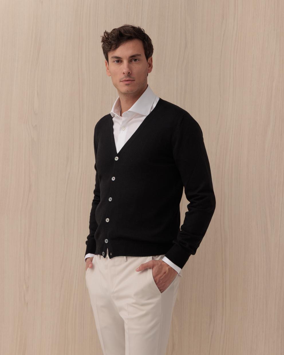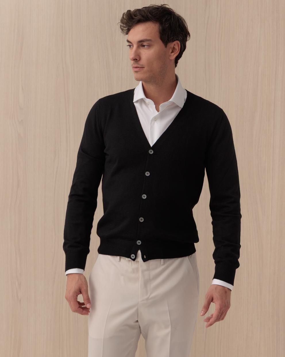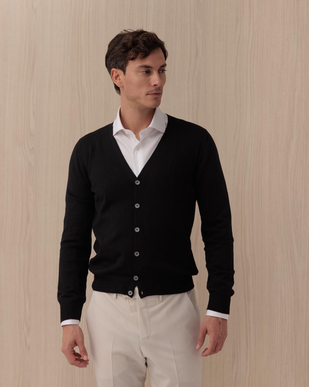 Scopri l'eleganza sottile del cardigan BARBA, un capo che incarna l'essenza dell'autunno/inverno 2026. Realizzato in pura lana vergine, questo cardigan con bottoni è un tributo all'artigianalità e alla cura sartoriale. Il design a coste sui polsini e sul fondo aggiunge un tocco di raffinatezza, mentre la vestibilità slim fit valorizza la silhouette, rendendolo ideale per un weekend in città o un incontro formale. Un capo che promette di diventare il tuo alleato di stile più fidato, offrendoti calore e comfort con un'eleganza senza tempo.- Vestibilità: Slim fit- Collezione: Autunno/Inverno 2026- Composizione: 100% Lana Vergine- Colore: Nero- Altezza modello: 186 cm; Taglia indossata: 50
