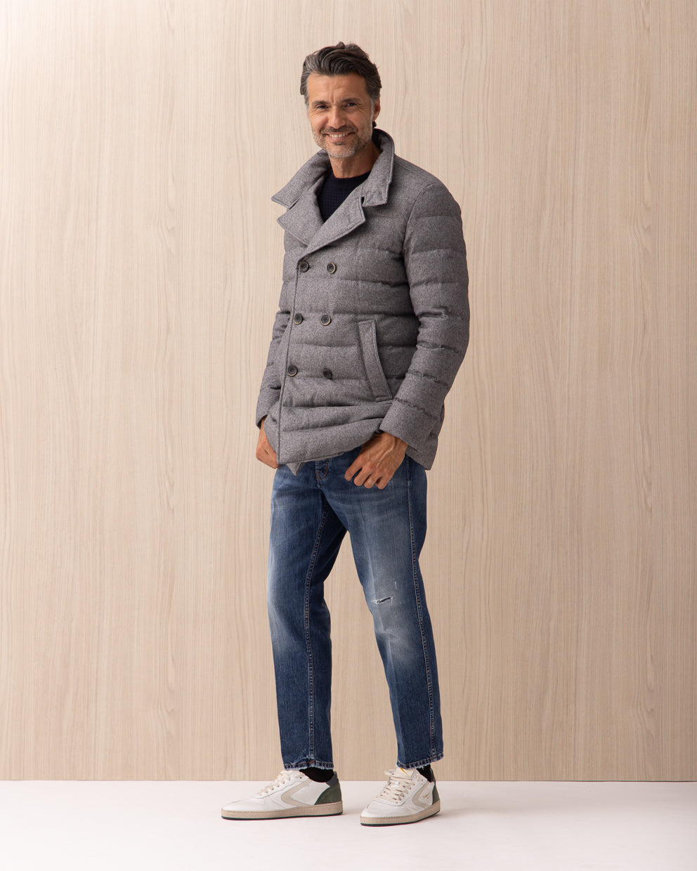 Scopri l'arte della sartoria con il piumino doppiopetto Herno, una fusione raffinata di eleganza senza tempo e funzionalità moderna. Questo capo, realizzato in un pregiato misto seta e cashmere, avvolge con un calore sofisticato e una morbidezza ineguagliabile. Ispirato al classico peacoat, presenta una chiusura doppiopetto e impunture orizzontali, perfetto per chi desidera distinguersi con sobrietà nelle fresche giornate autunnali o invernali. Ideale per un weekend in città o un incontro formale, questo giubbotto incarna lo stile urbano e raffinato.- Vestibilità: Regular Fit- Collezione: Autunno/Inverno 2026- Composizione: 51% Seta, 49% Cashmere- Colore: Grigio