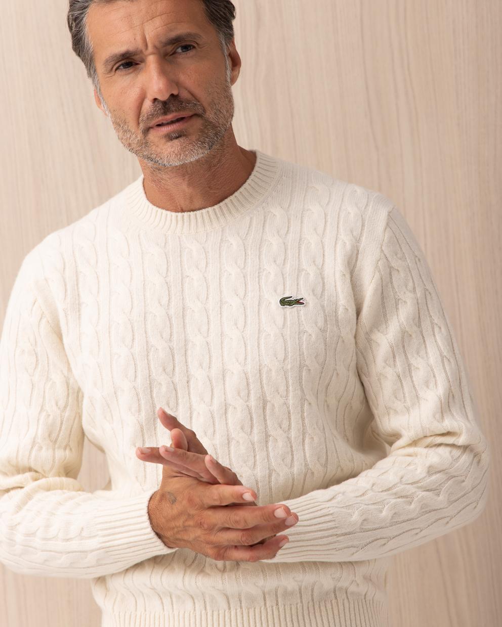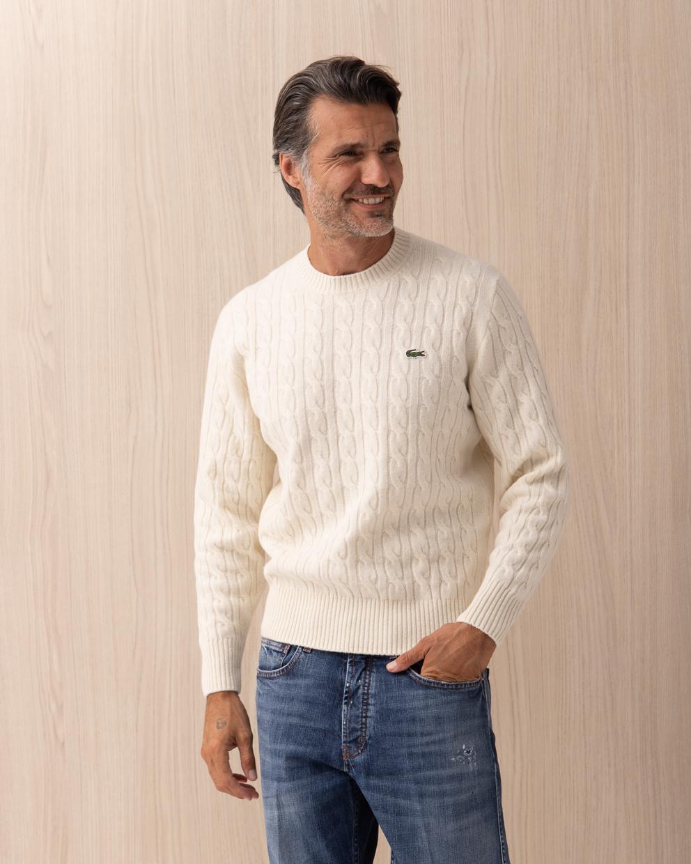 Maglia Lacoste bianca in lana cardata con dettagli a treccia
