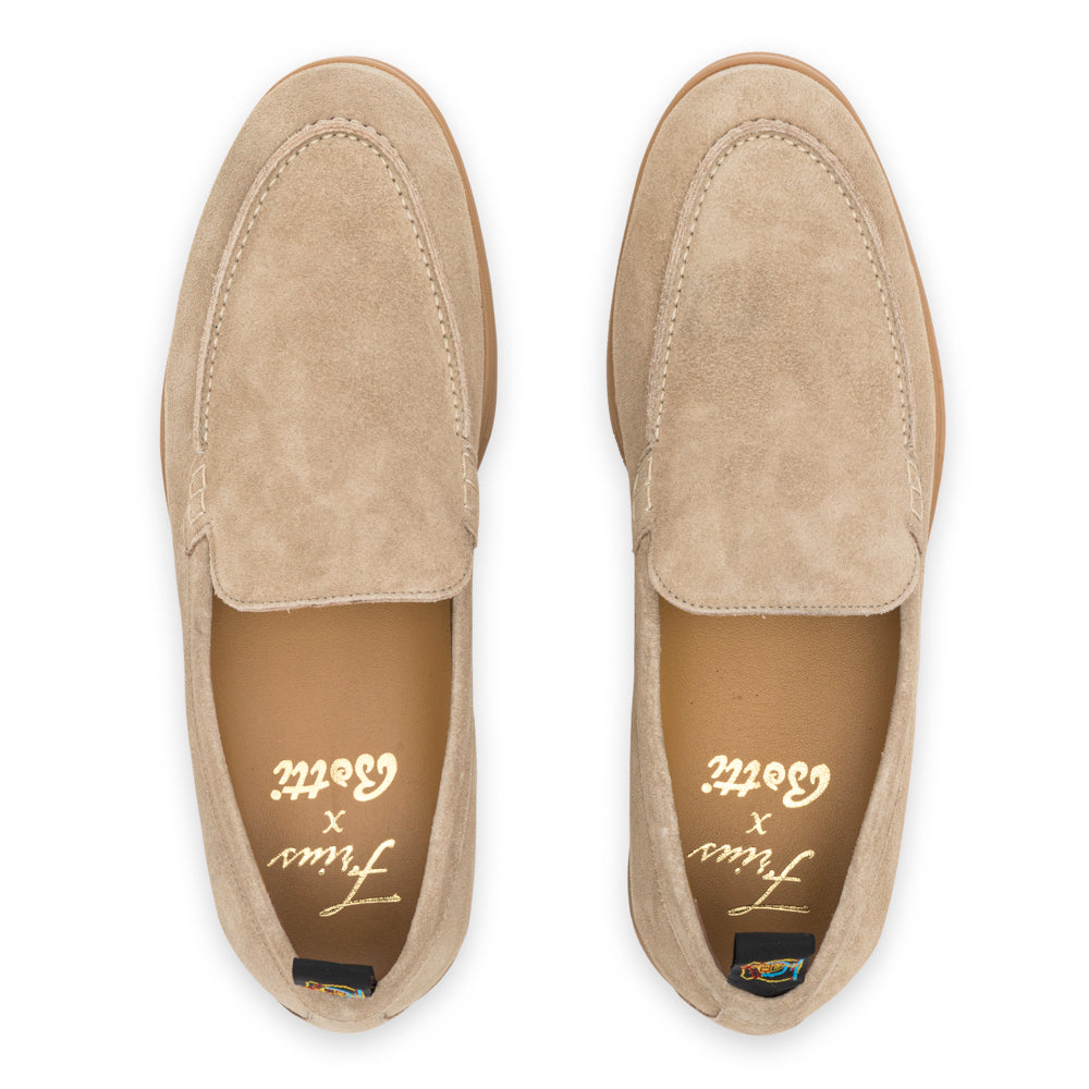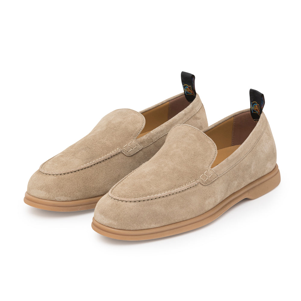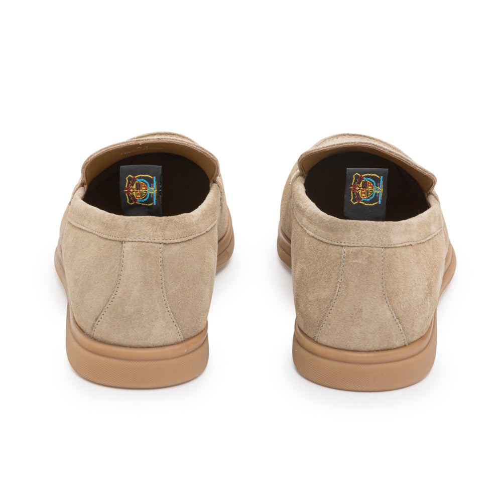 Suede moccasin shoe with leather upper and interior, rubber sole.