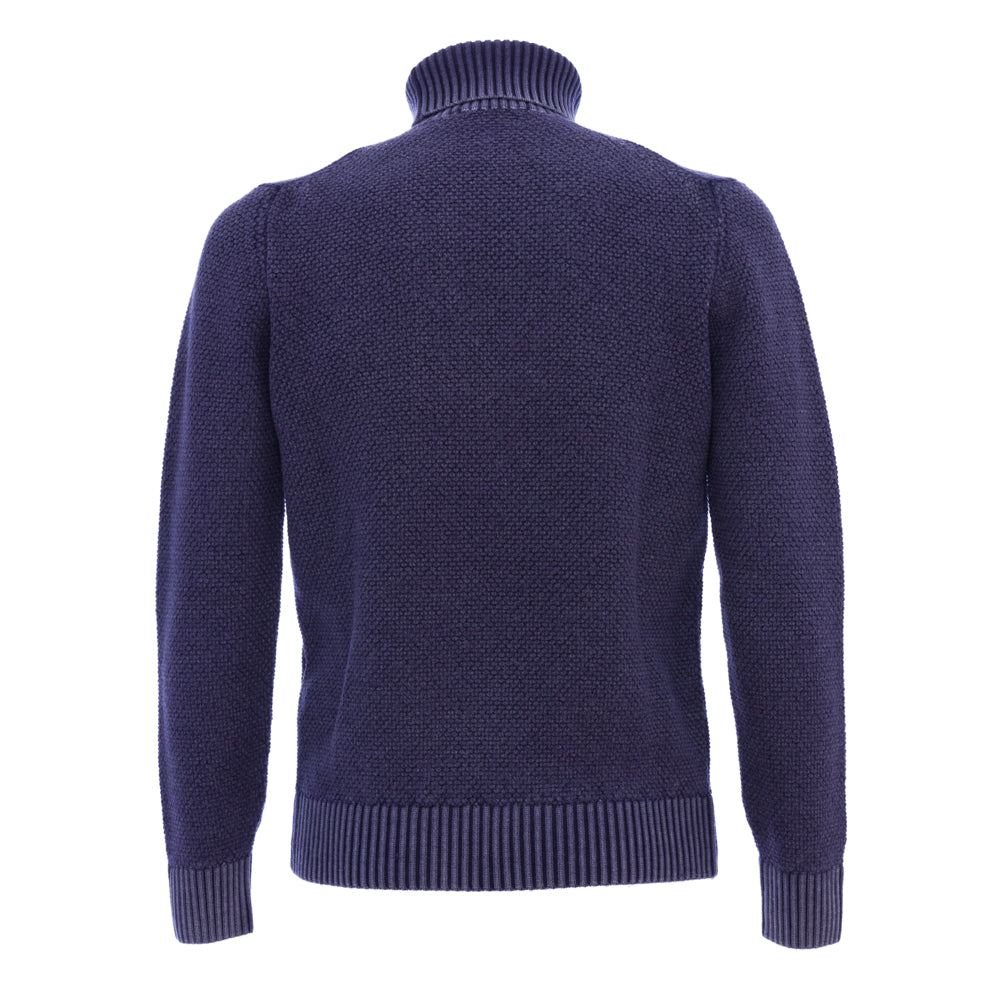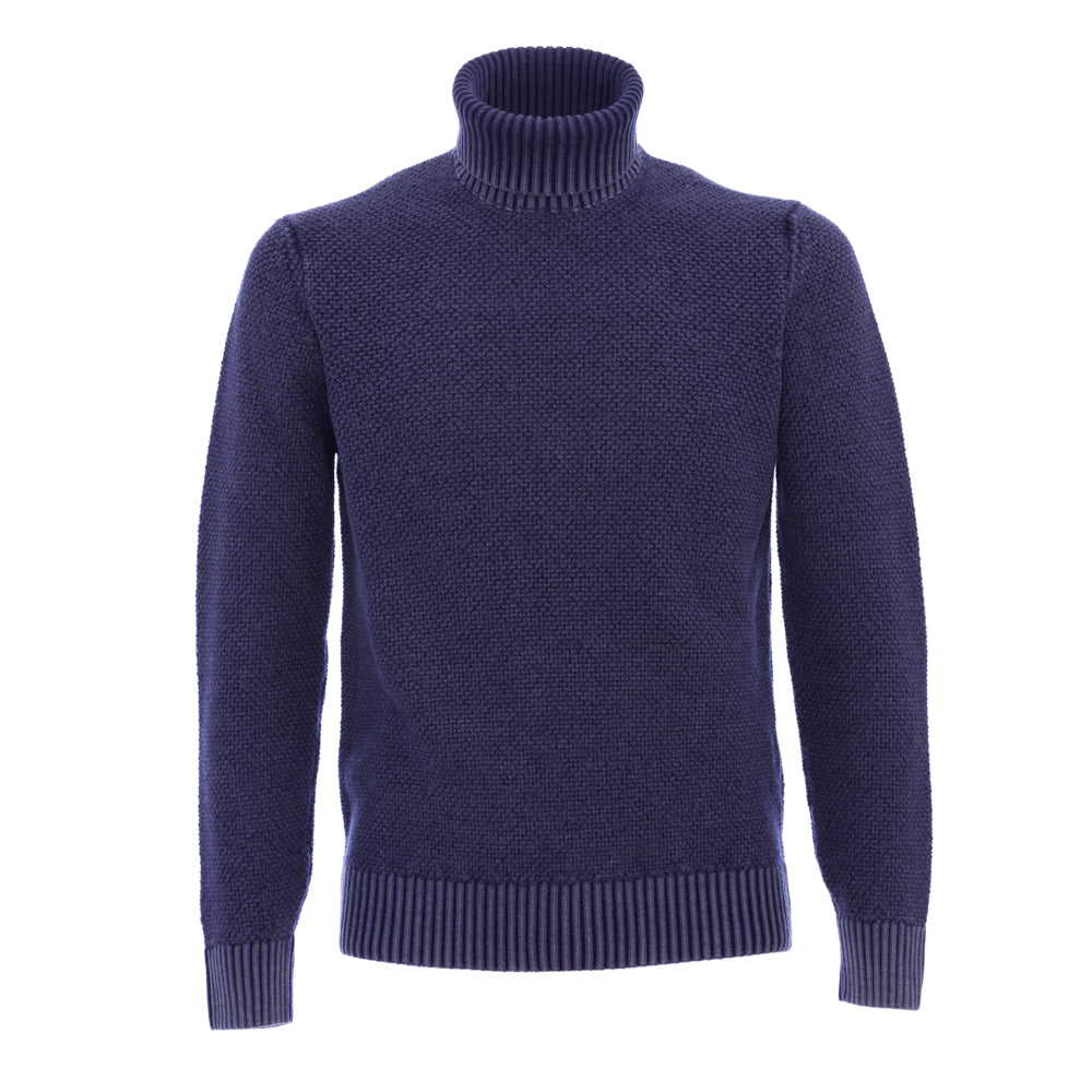 Turtleneck in extrafine merino wool, frosted garment dyed. Straight overshirt with ribbed detail. Flounce at the bottom of the sleeve and on the neck. Fineness 7.
