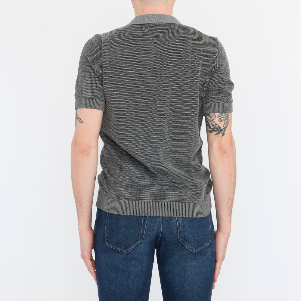 Short sleeve polo worked in rice stitch. Collar, cuffs, and band at the bottom in ribbed knit. Front closure with three buttons.