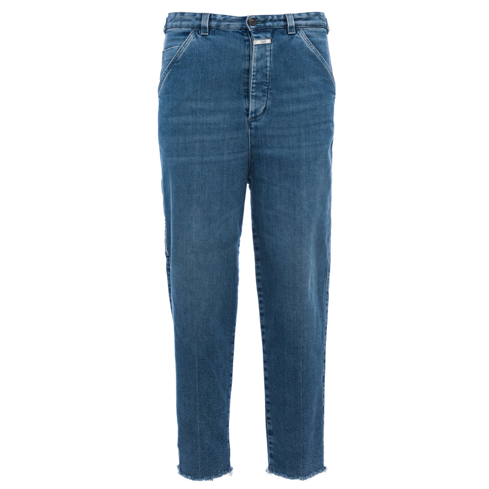 In innovative stretch denim with natural rubber elastic yarn, completely biodegradable. The Dover Tapered in a workwear-inspired look with a mid-blue wash, distressed edges and a frayed hem.