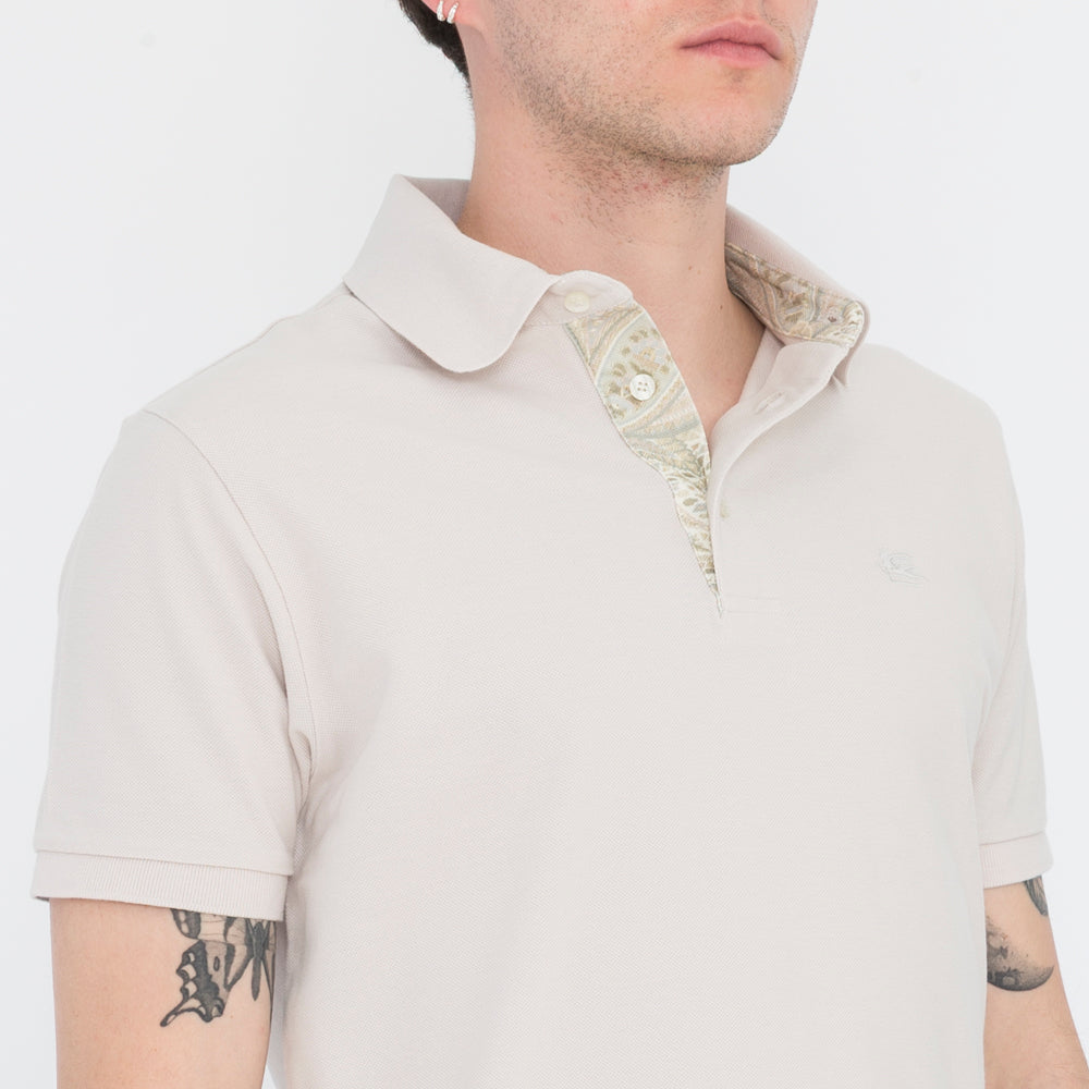 Polo manica corta in piquet di cotone. Colletto di dimensione leggermente più piccola del tradizionale con all'interno stampa a contrasto floreale. Chiusura a tre bottoncini. Logo del pegaso ricamato frontalmente sul lato sinistro. Polsini con tessuto a costine. Prodotto Made in Italy.