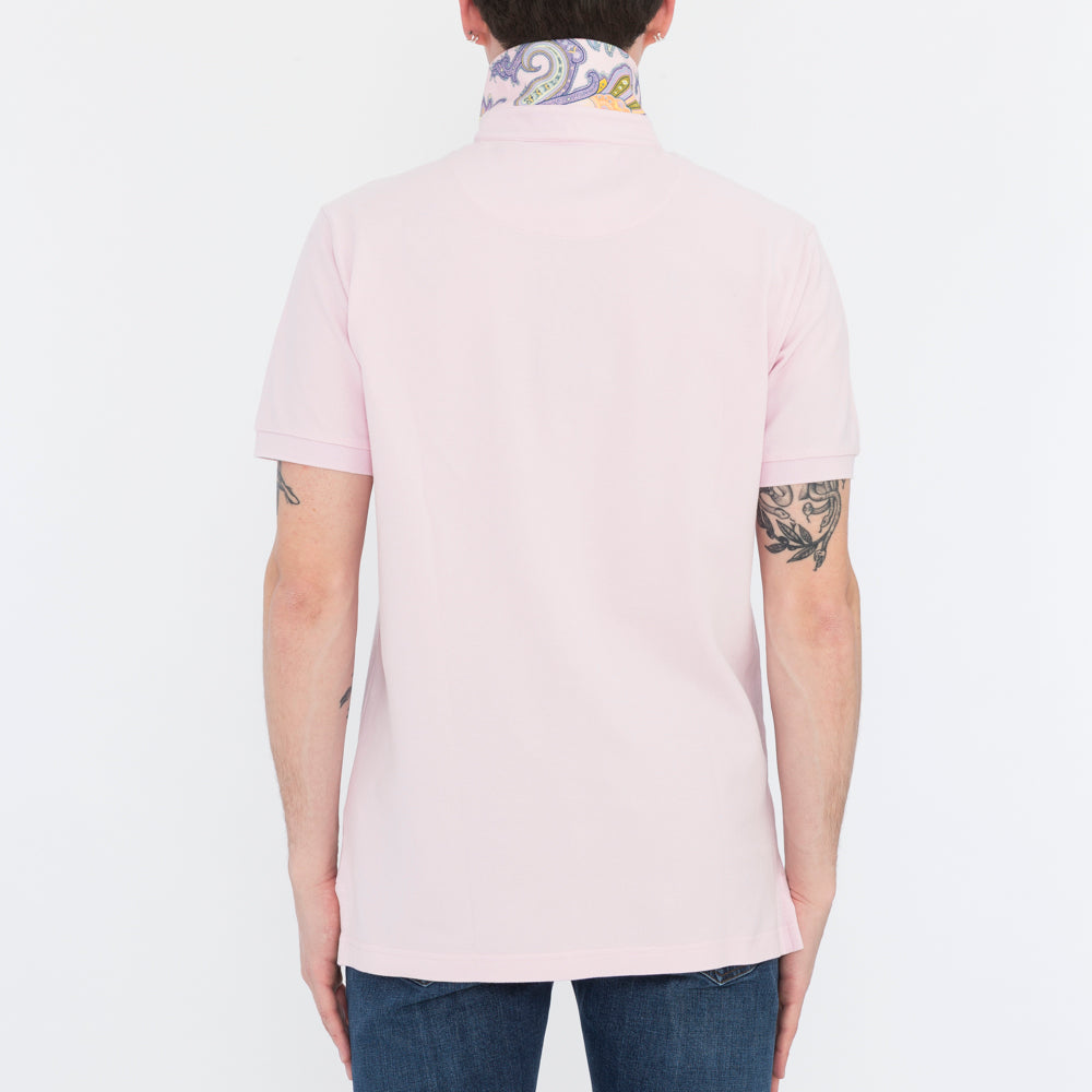Polo Manica Corta in piquet di cotone. Colletto di dimensione leggermente più piccola del tradizionale e sottocollo con stampa a contrasto fantasia fiori. Chiusura a tre bottoncini. Logo del pegaso, ricamato frontalmente sul lato sinistro. Polsini con tessuto a costine. Prodotto Made in Italy.
