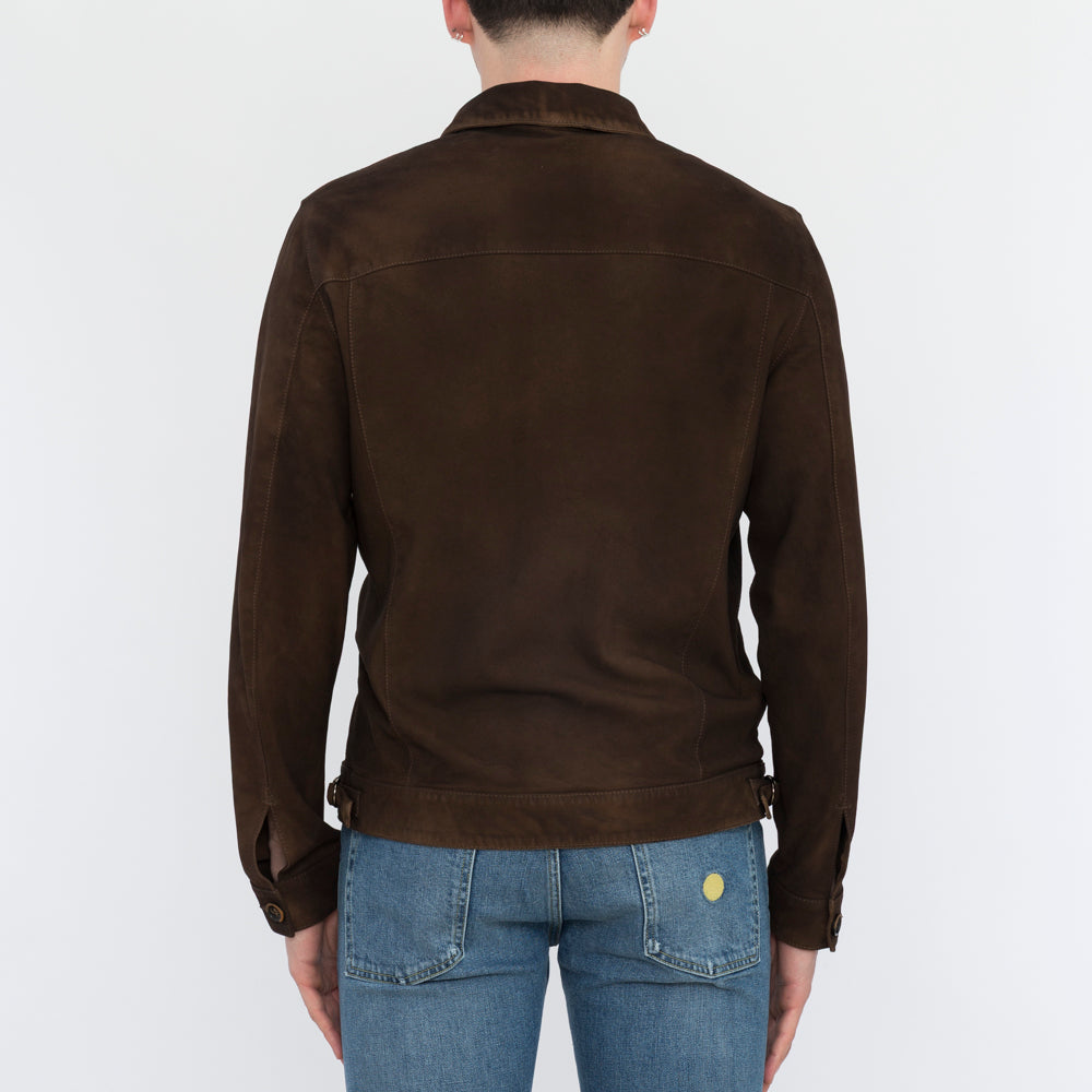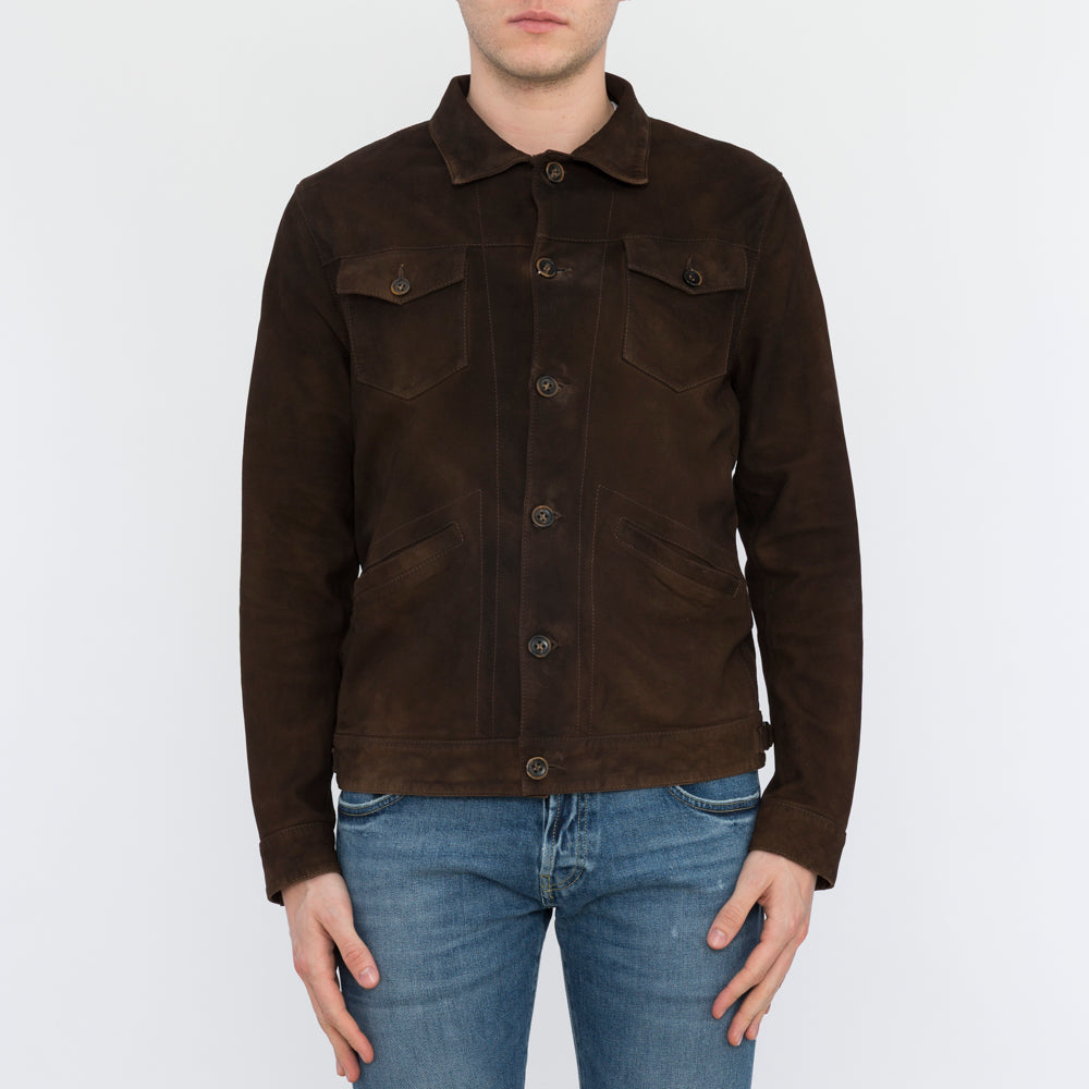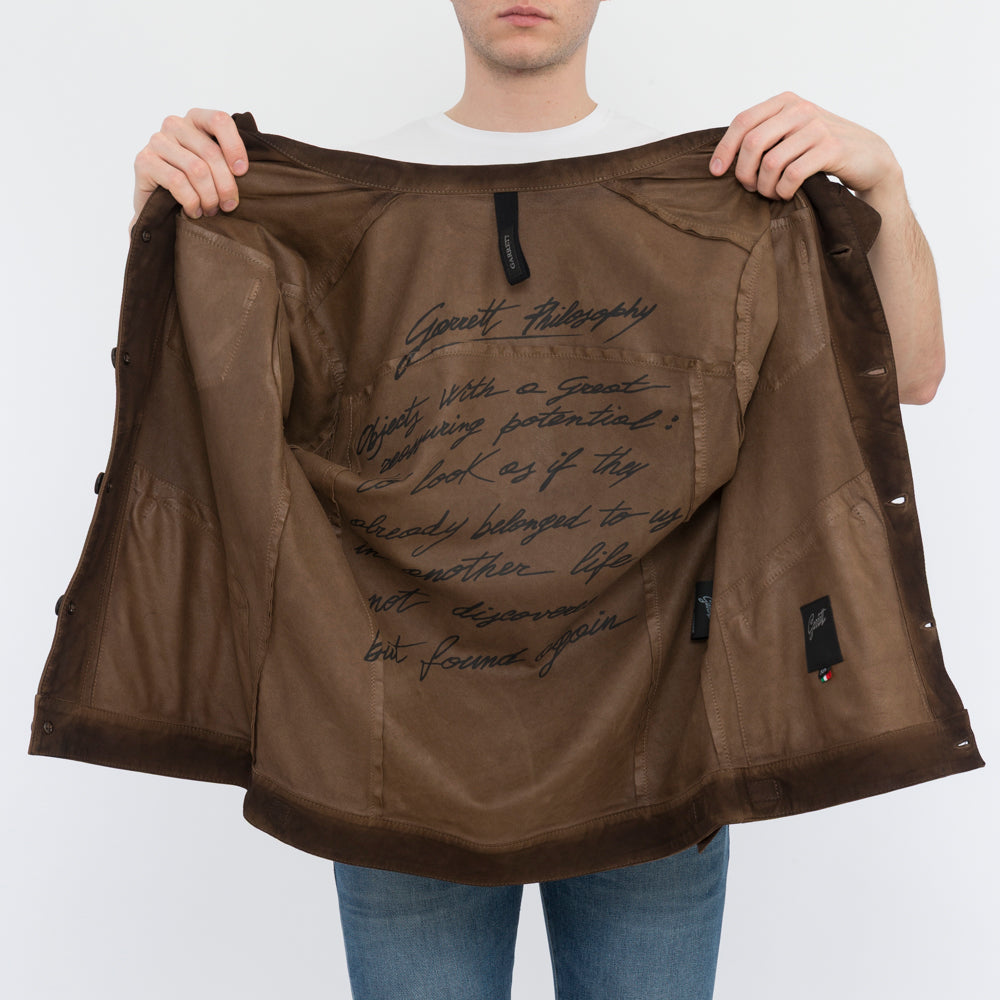 The softness and elegance of the suede goat leather, enhanced by the artisanal treatment of natural wax buffing, offer a combination of harmony and grit that makes the garment versatile, suitable for both formal and more casual occasions. The unlined interior is paired with a transparent film that protects the natural color of the leather while also providing softness to the sahariana, which becomes like a second skin. The vintage look of the handcrafted buttons conforms to the overall look of the field jacket.