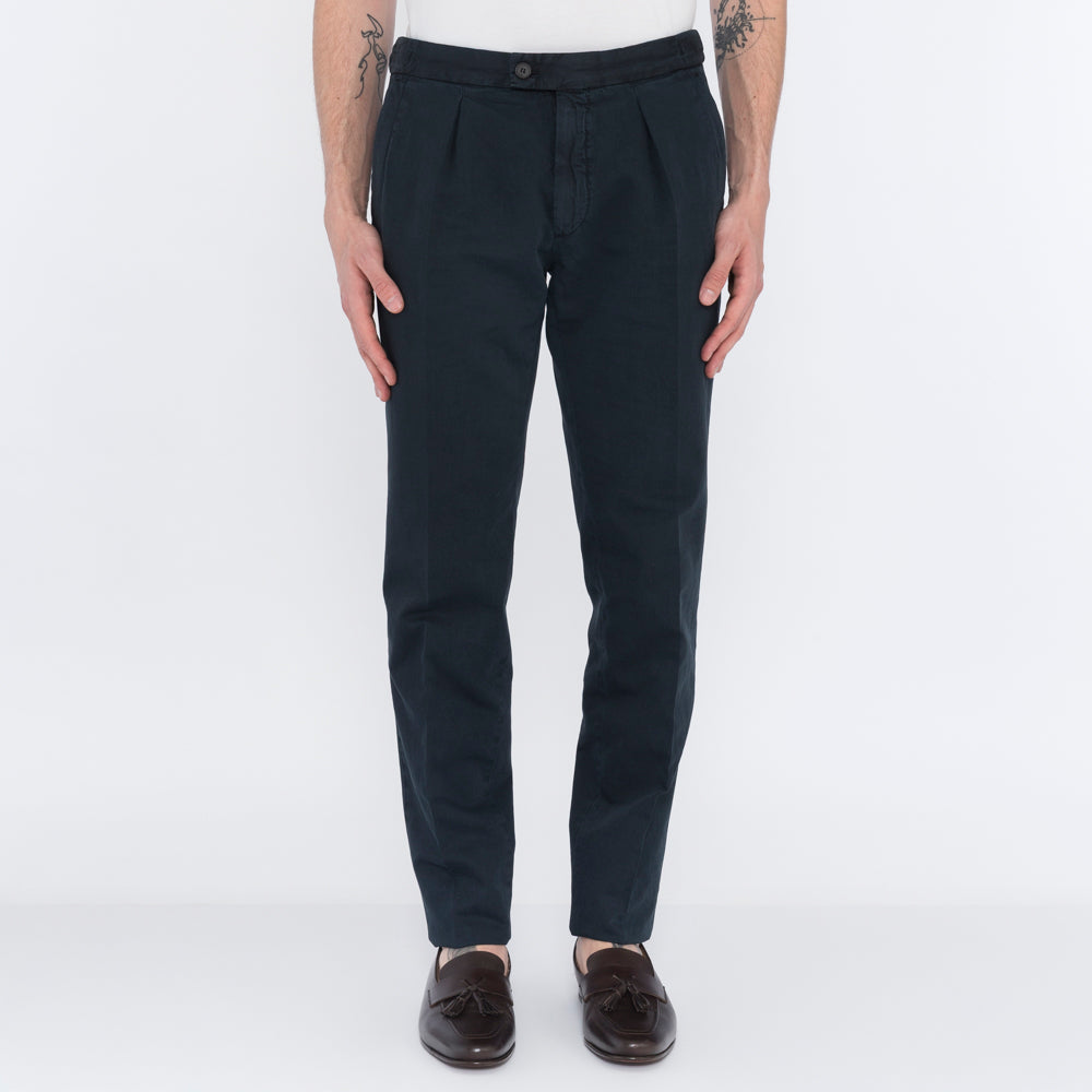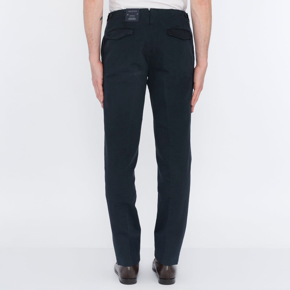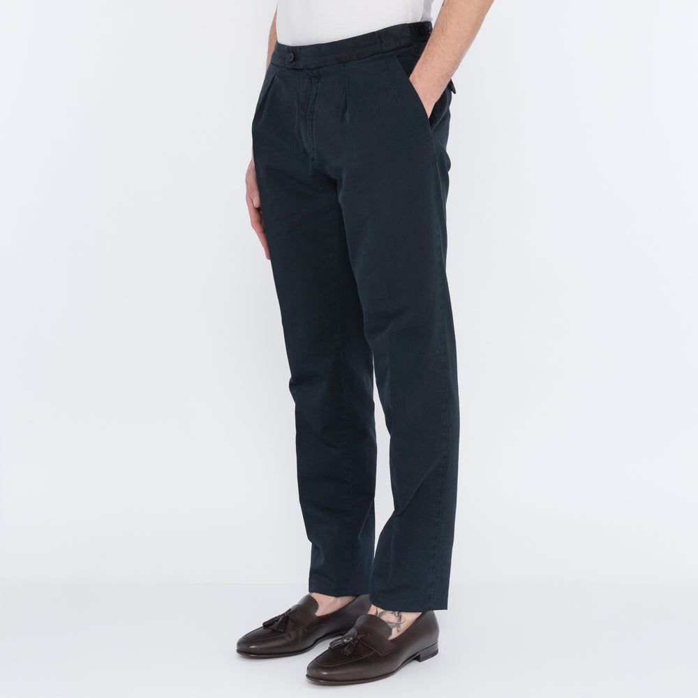 Pantalone con chiusura frontale nascosta. Passanti. Due tasche laterali america. Due tasche posteriori con pattina.