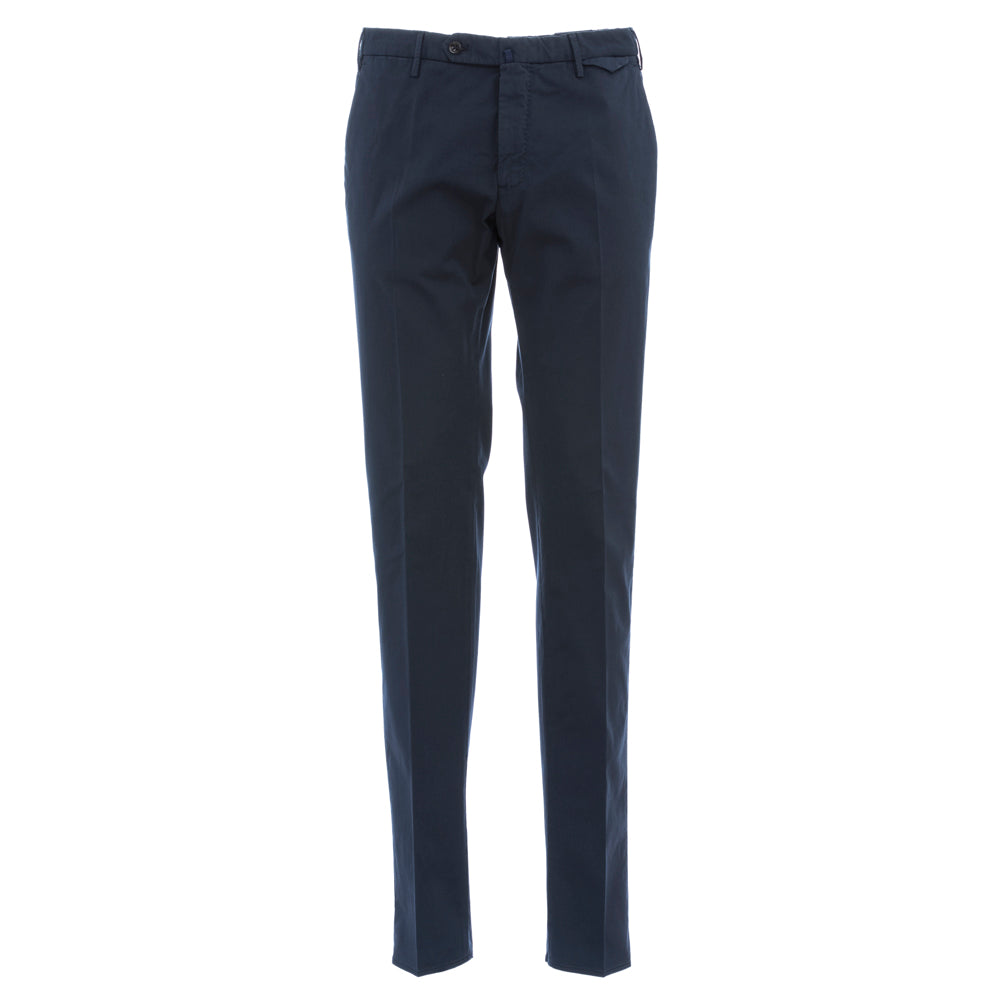 Trousers with hidden front closure. Passers-by. Two side welt pockets. Two back welt pockets. Tailored cut.