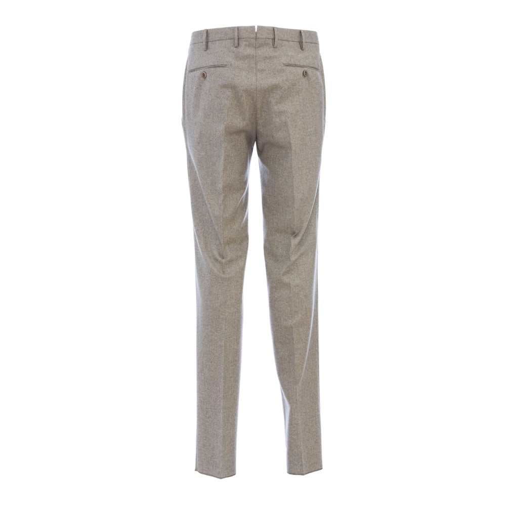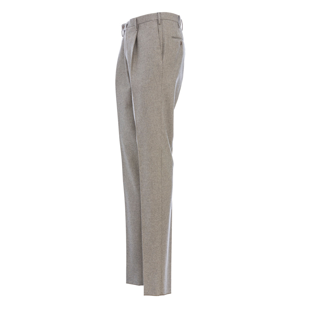 Wool trousers with front pleat, American front pockets, back pockets with buttoned welt, hidden zip and button closure.