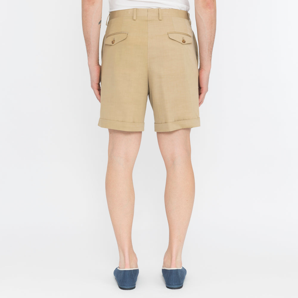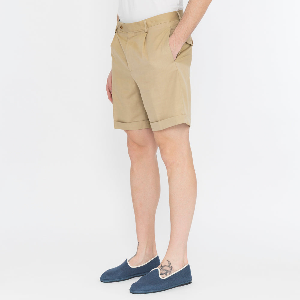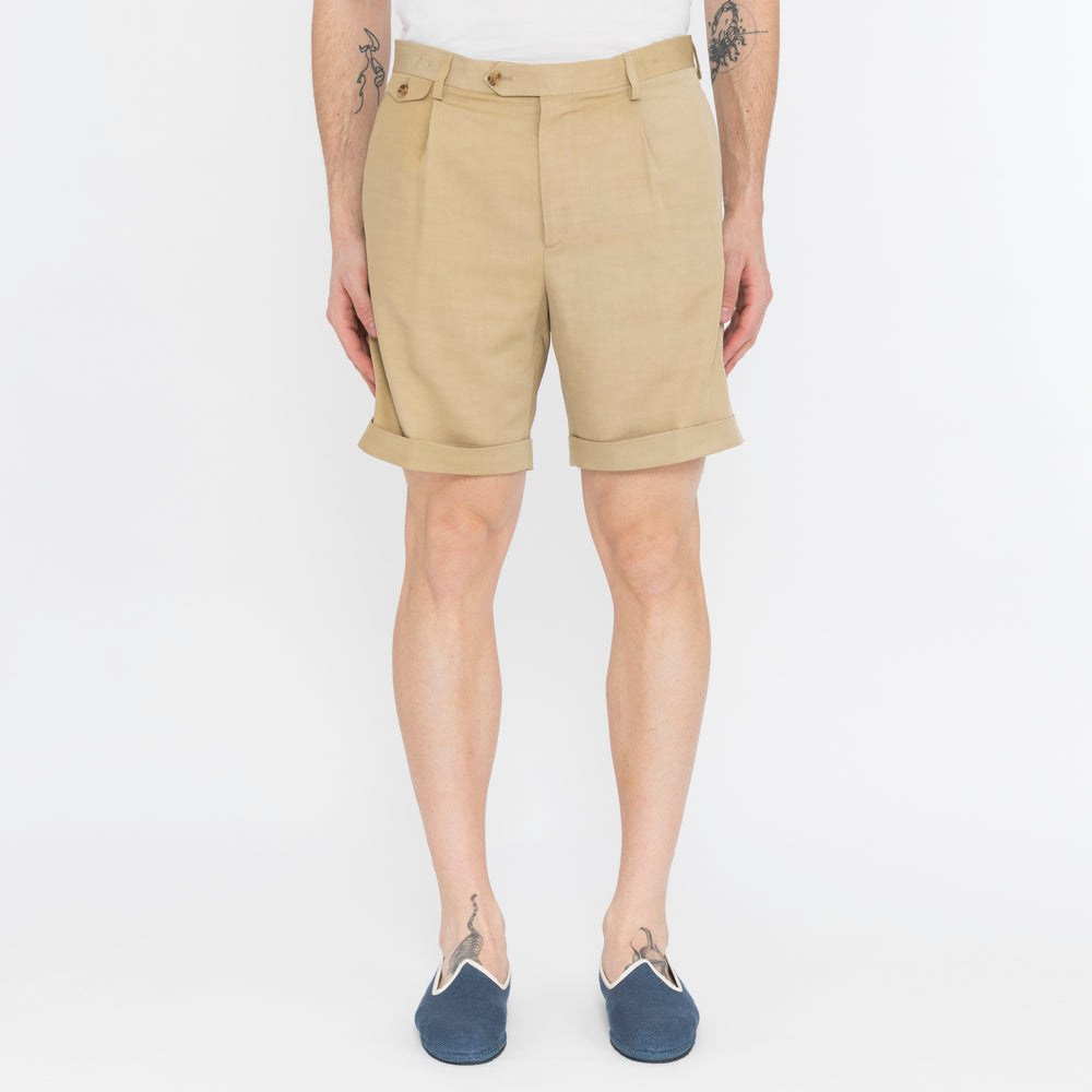 Bermuda shorts with pleats at the bottom, zip and button closure, back pockets with flap and button.