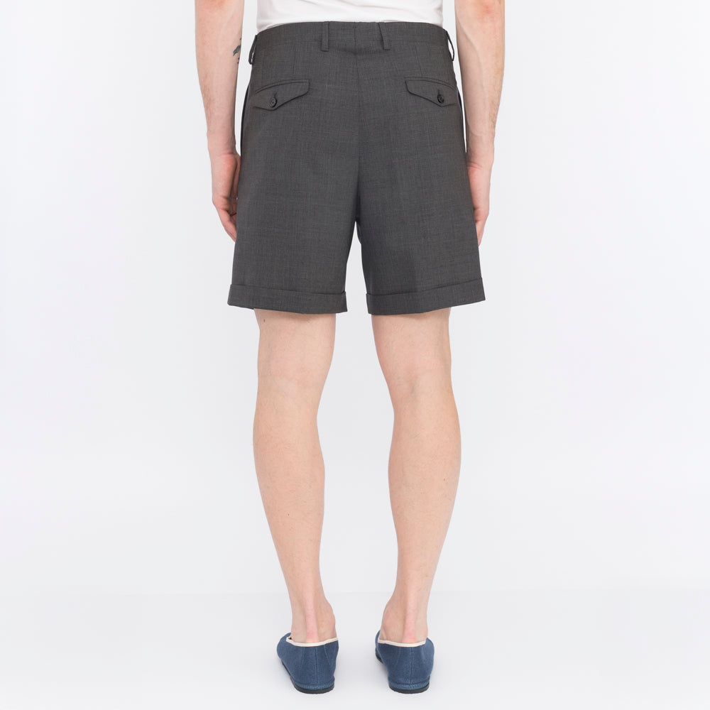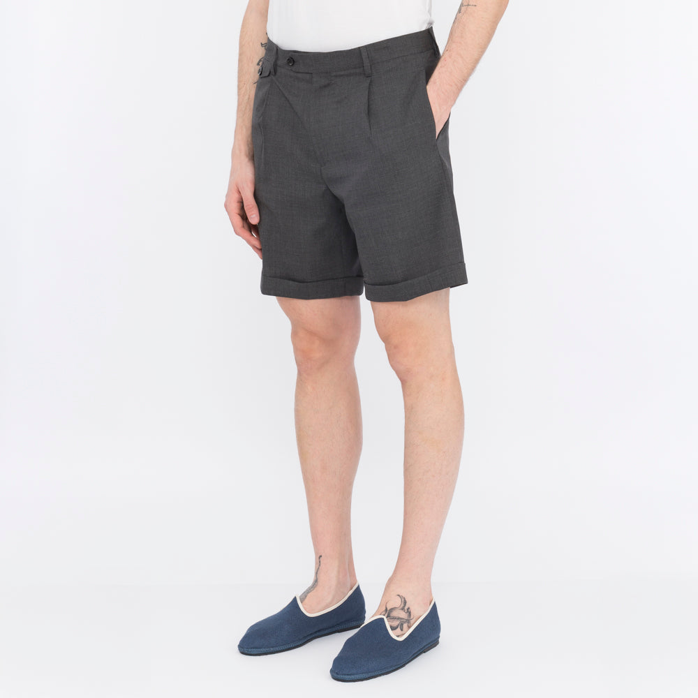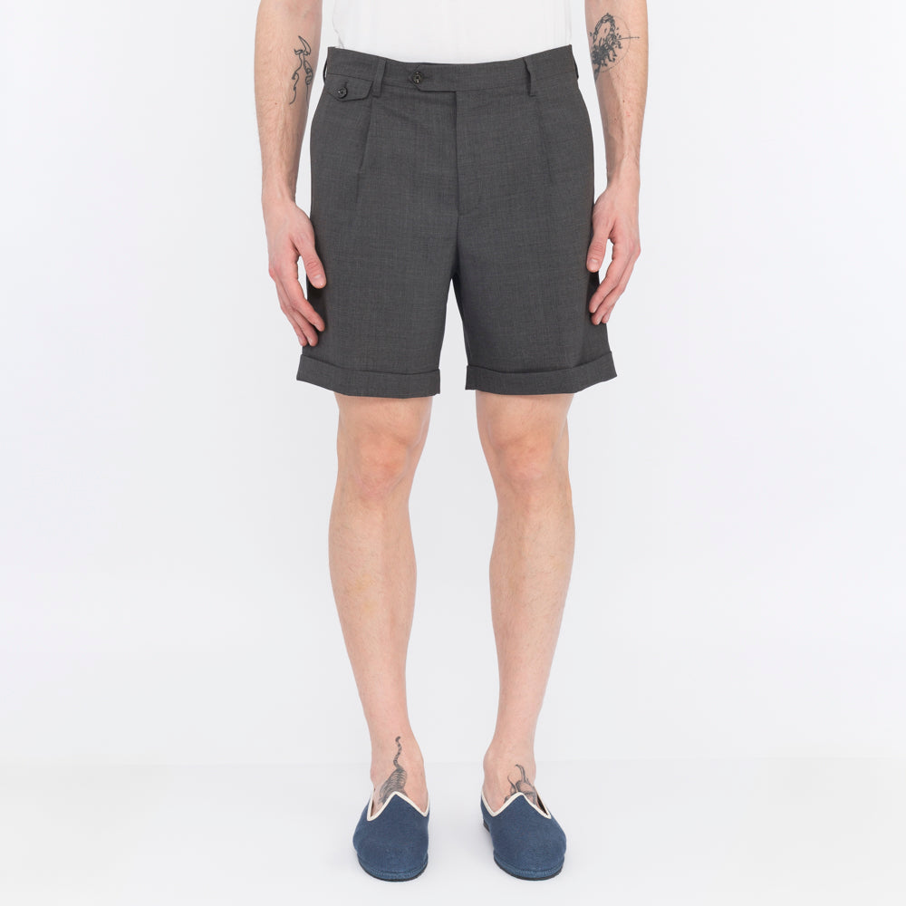 Bermuda shorts with pleats at the bottom, zip and button closure, back pockets with flap and button.