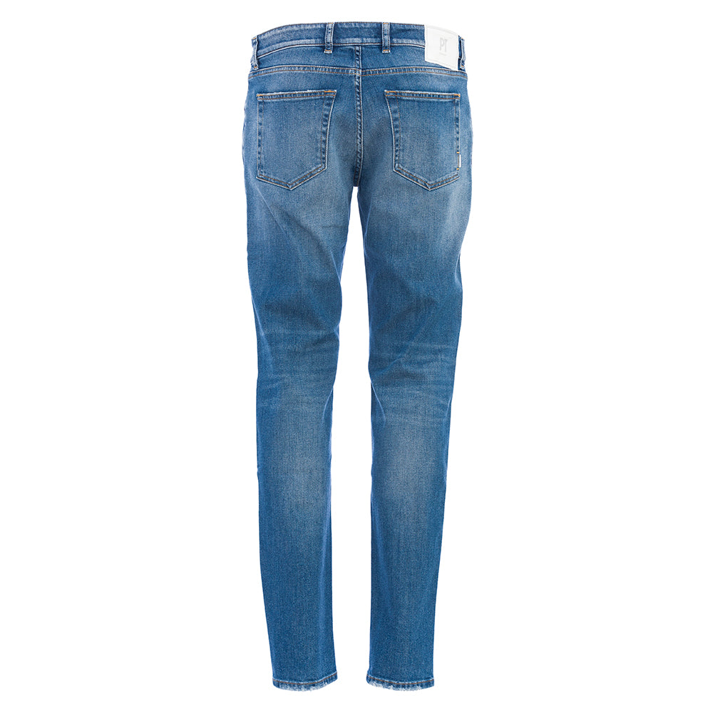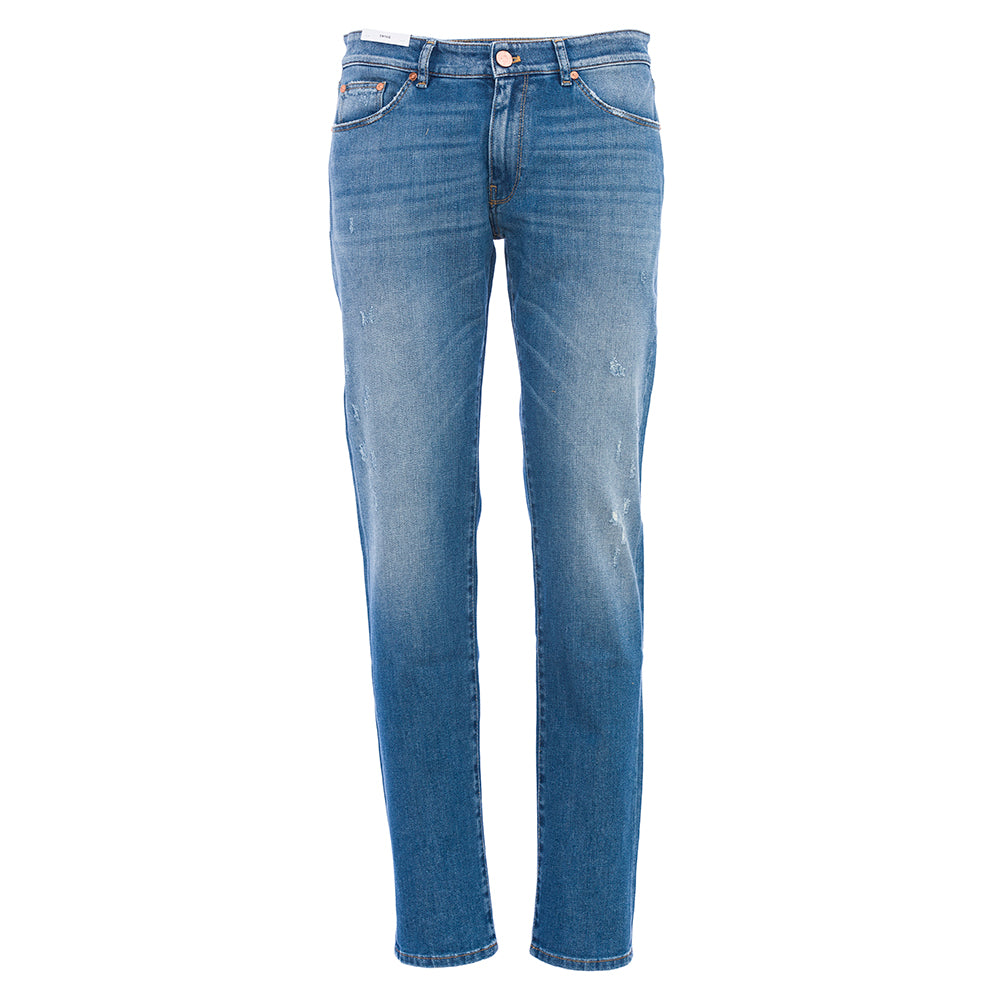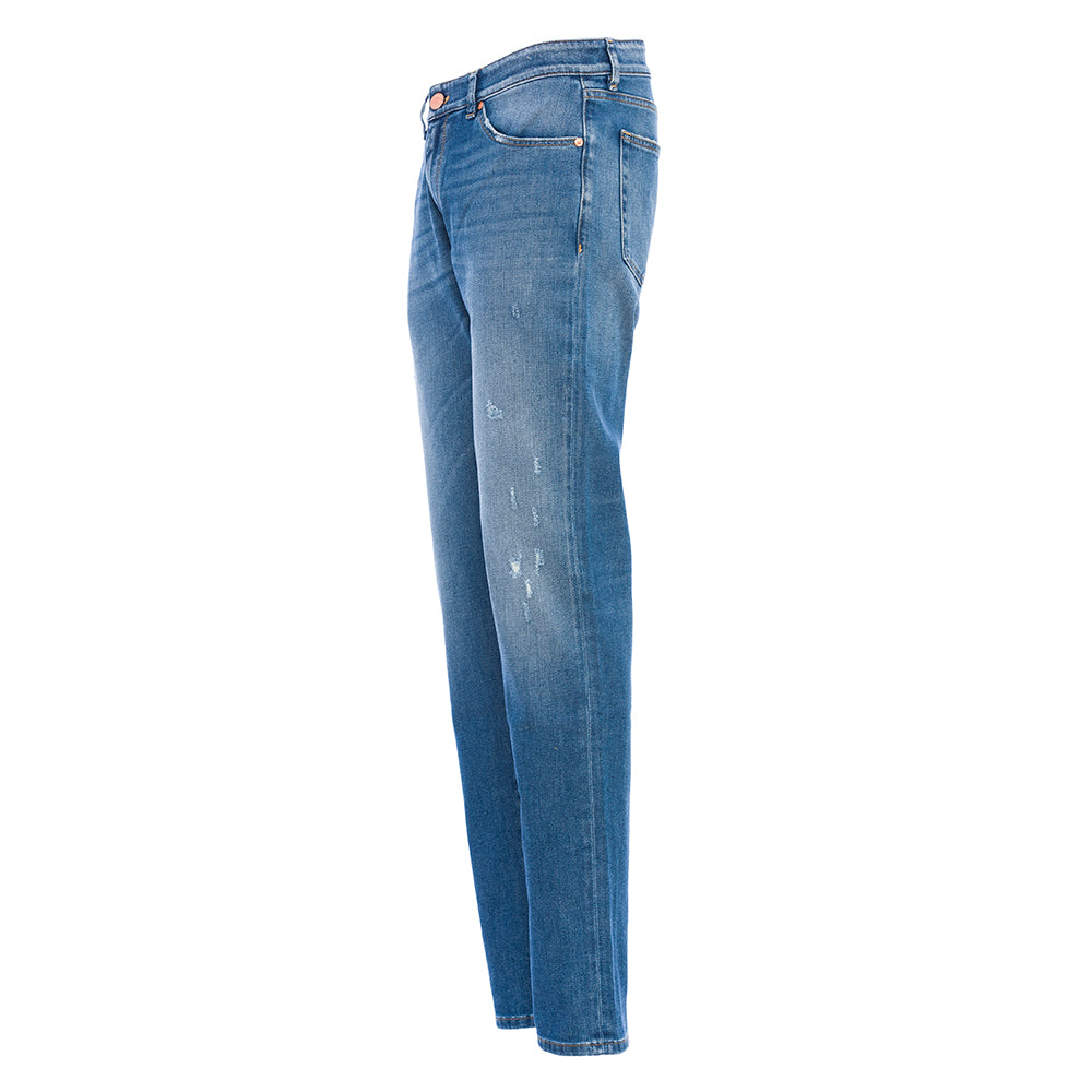 Stretch denim jeans with a soft, comfortable and resistant fabric, with a medium wash and small tears on the front that give character. With five pockets and a straight line, they are travel denim perfect for completing casual and free time looks.