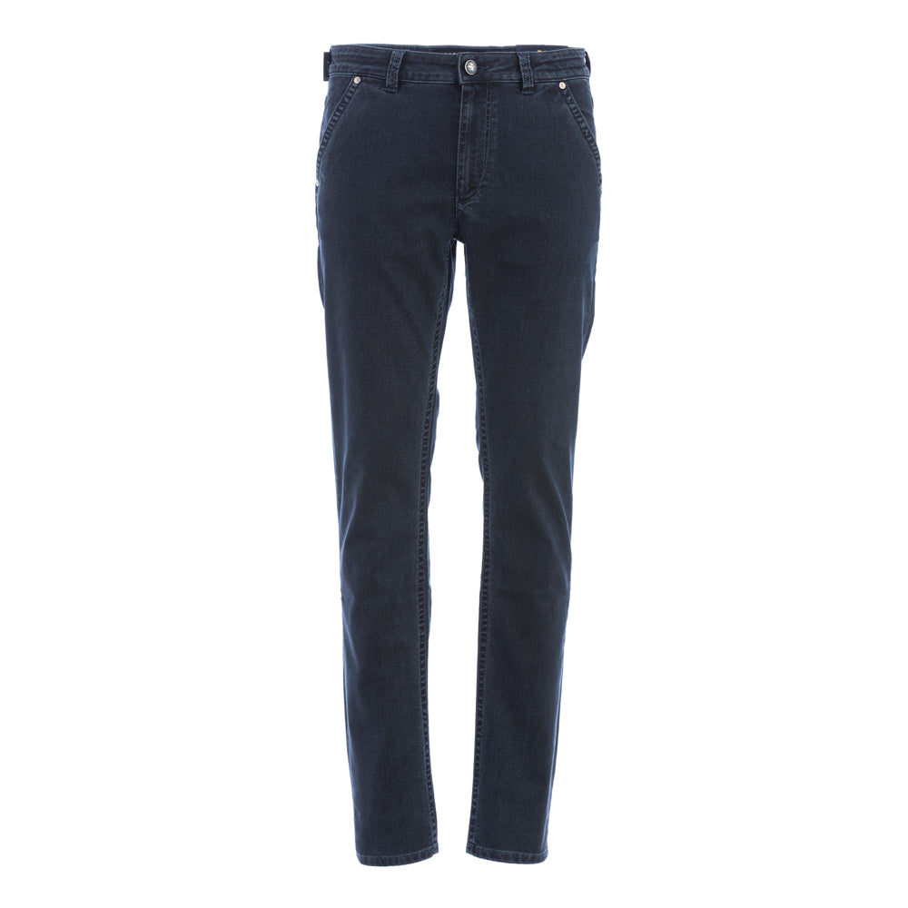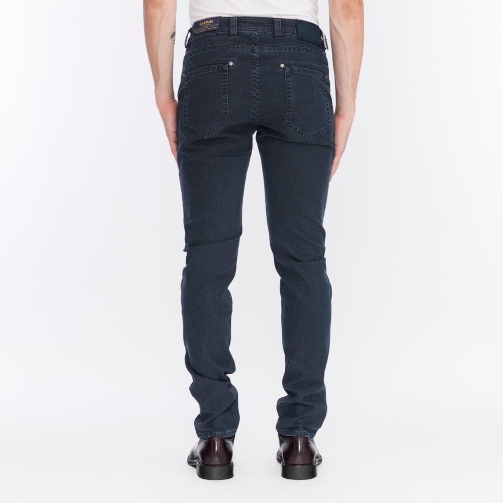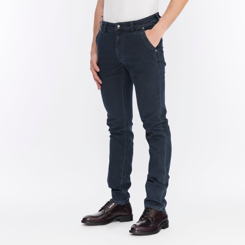 Jacquard denim trousers with four pockets, zip and button closure.