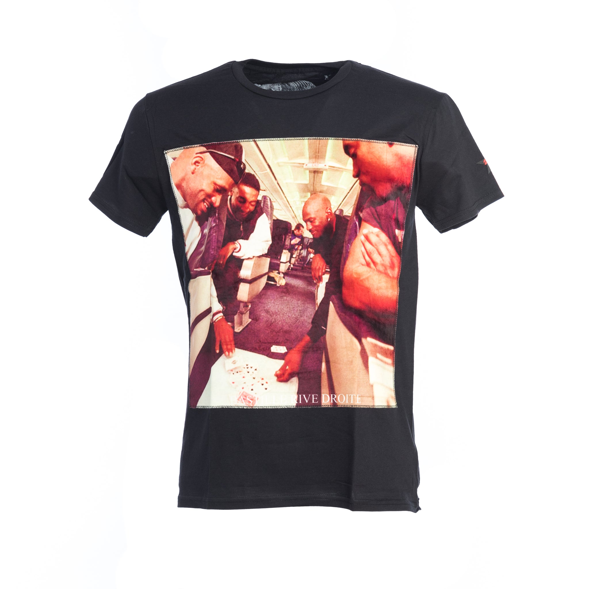 Bastille crew-neck T-shirt in black cotton and Alcantara application on the front with Poker print
