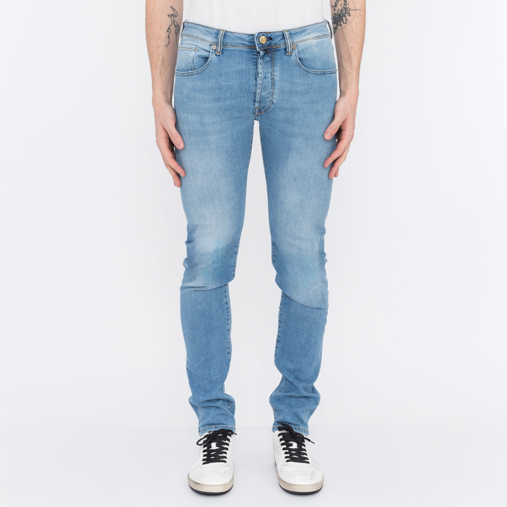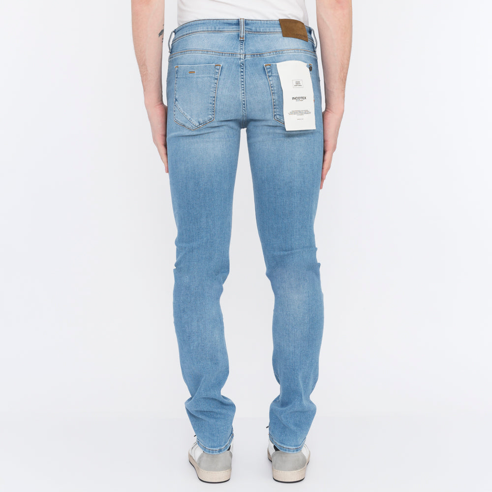 Straight jeans with a mid-rise waist, five pockets, slim fit, front button closure, classic design.