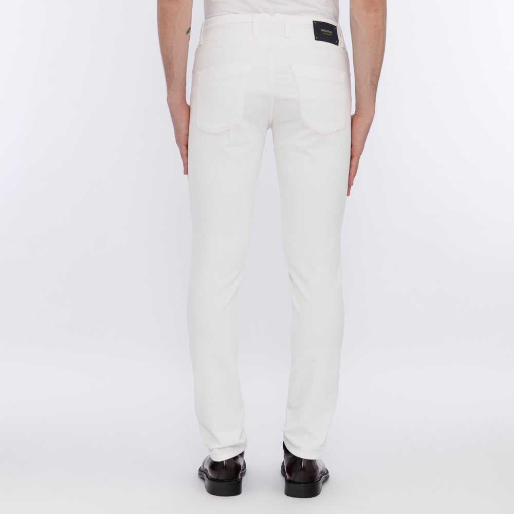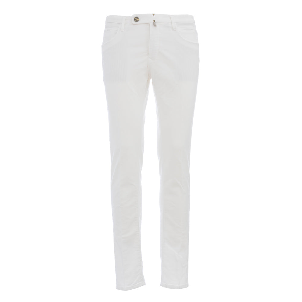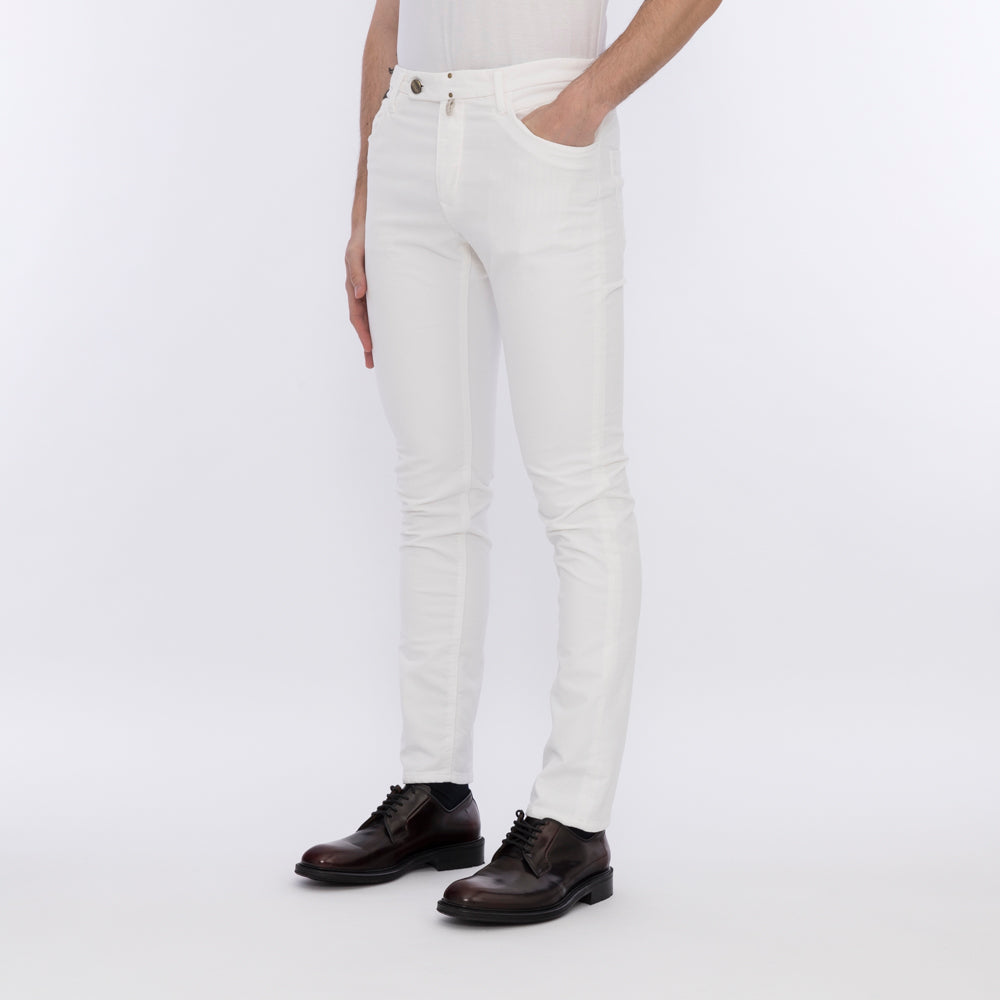 Diagonal velvet trousers, belt loops, button closure, two side pockets, central pleats, two welt pockets on the back.