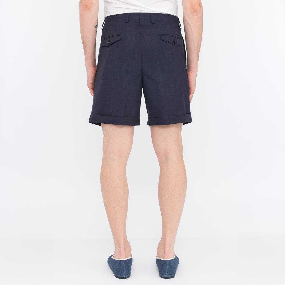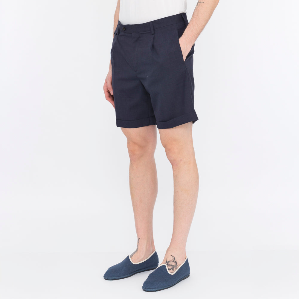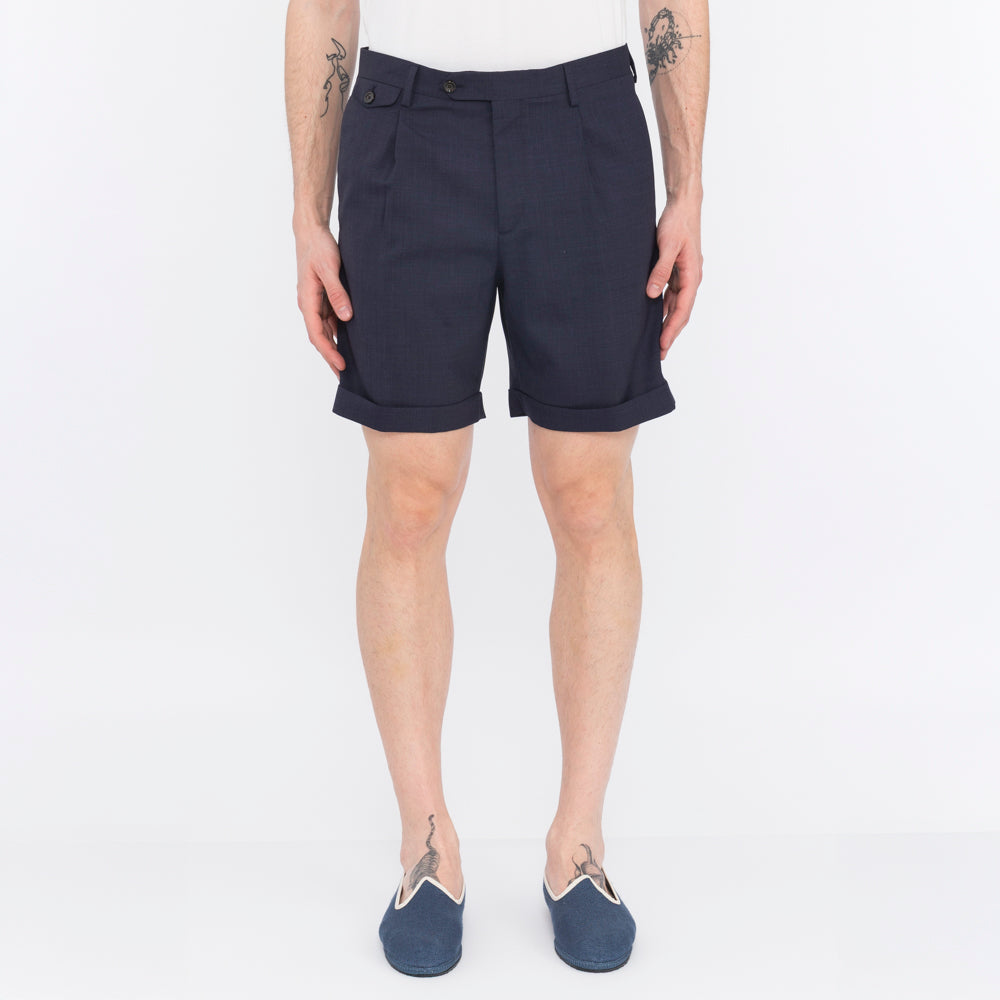 Bermuda shorts with pleats at the bottom, zip and button closure, back pockets with flap and button.