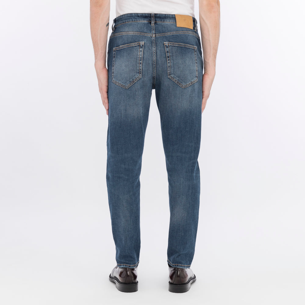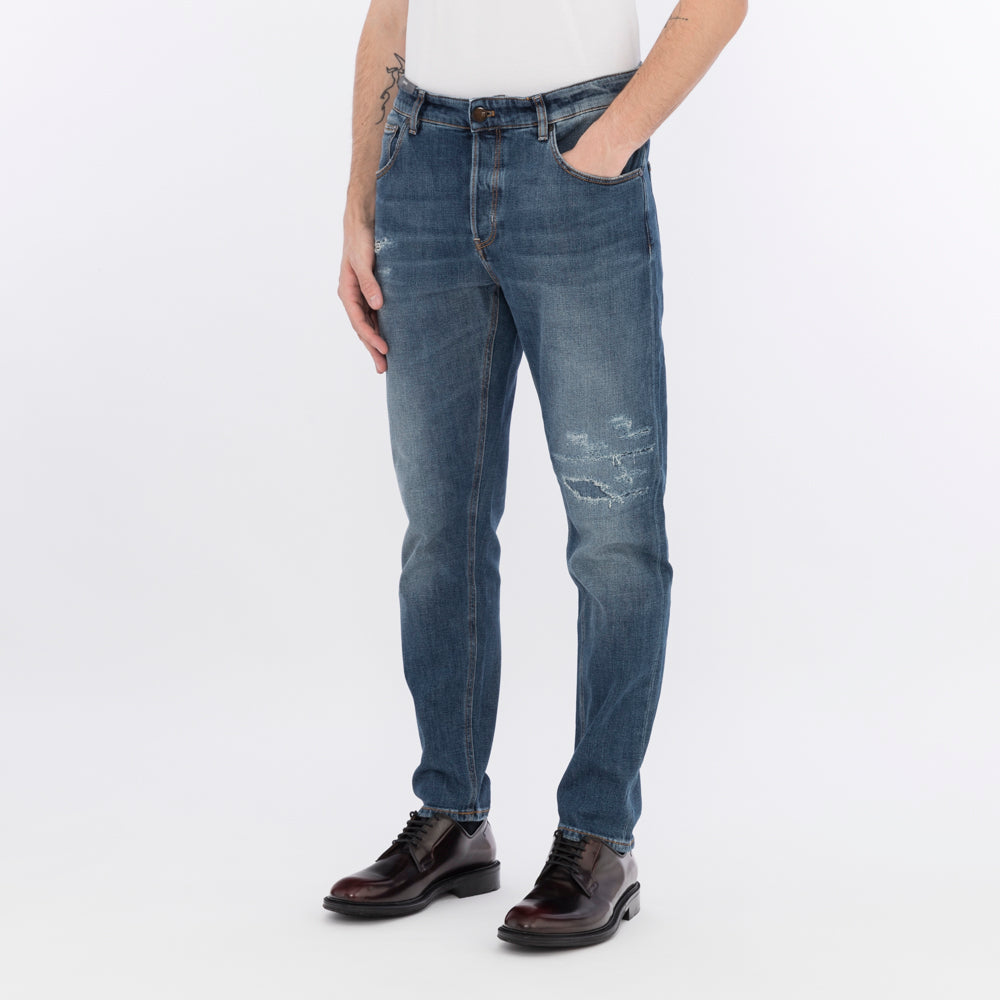 Tapered fit jeans in light stretch denim with tears. 5 pockets, watch pocket, button closure, belt loops.