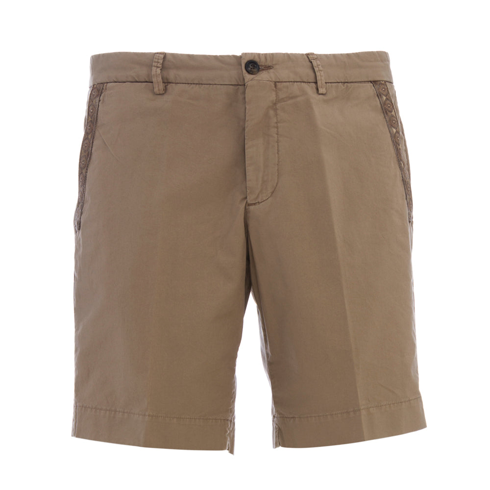 Bermuda shorts with applications and embroidery, medium length with zip and button closure, turn-up on the bottom, two side pockets and two on the back.