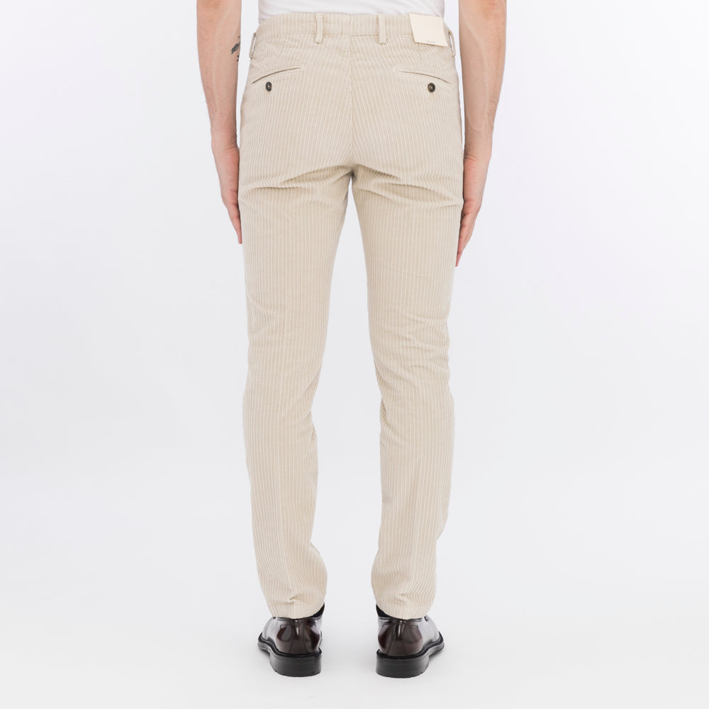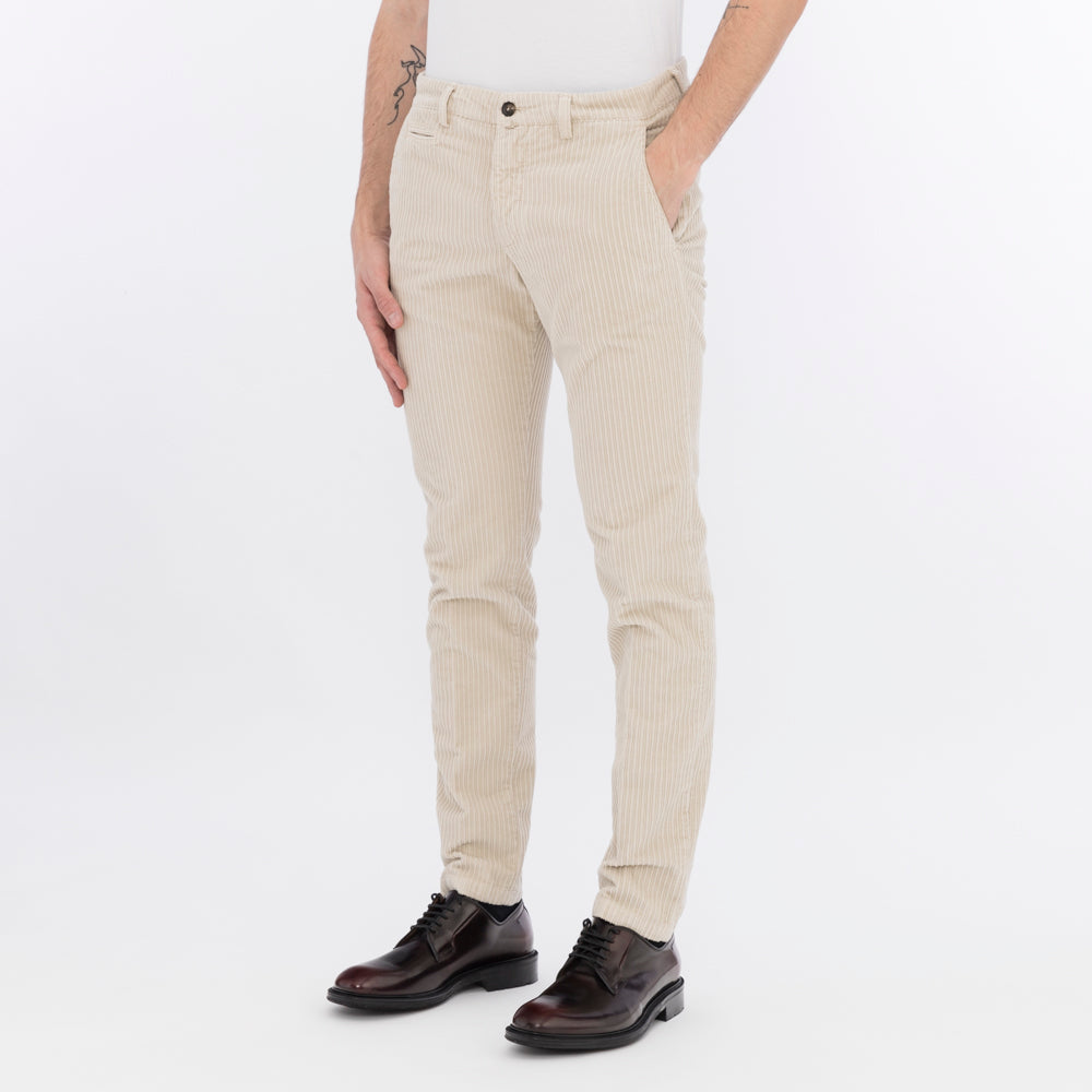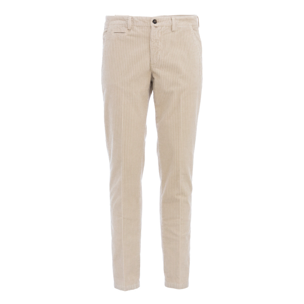 Ribbed trousers with front zip and button closure, belt loops, American pockets on the front and two welt pockets on the back.
