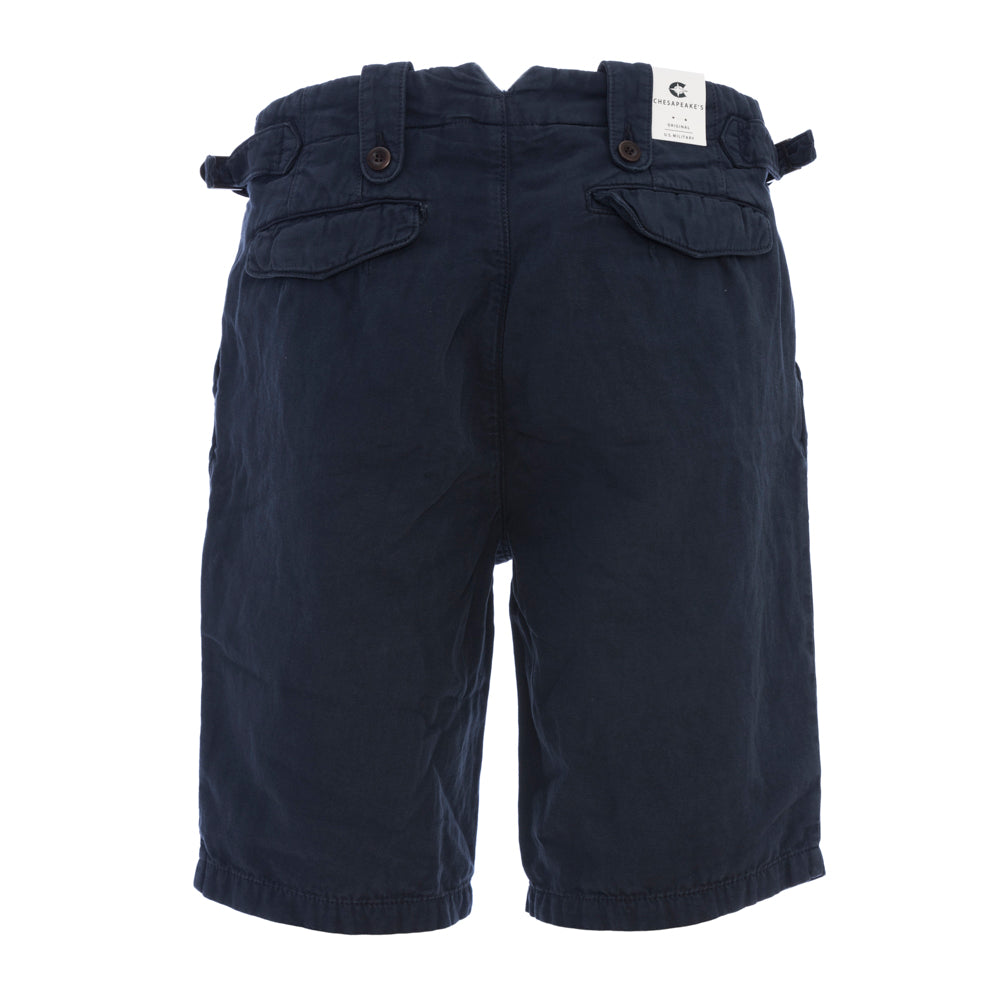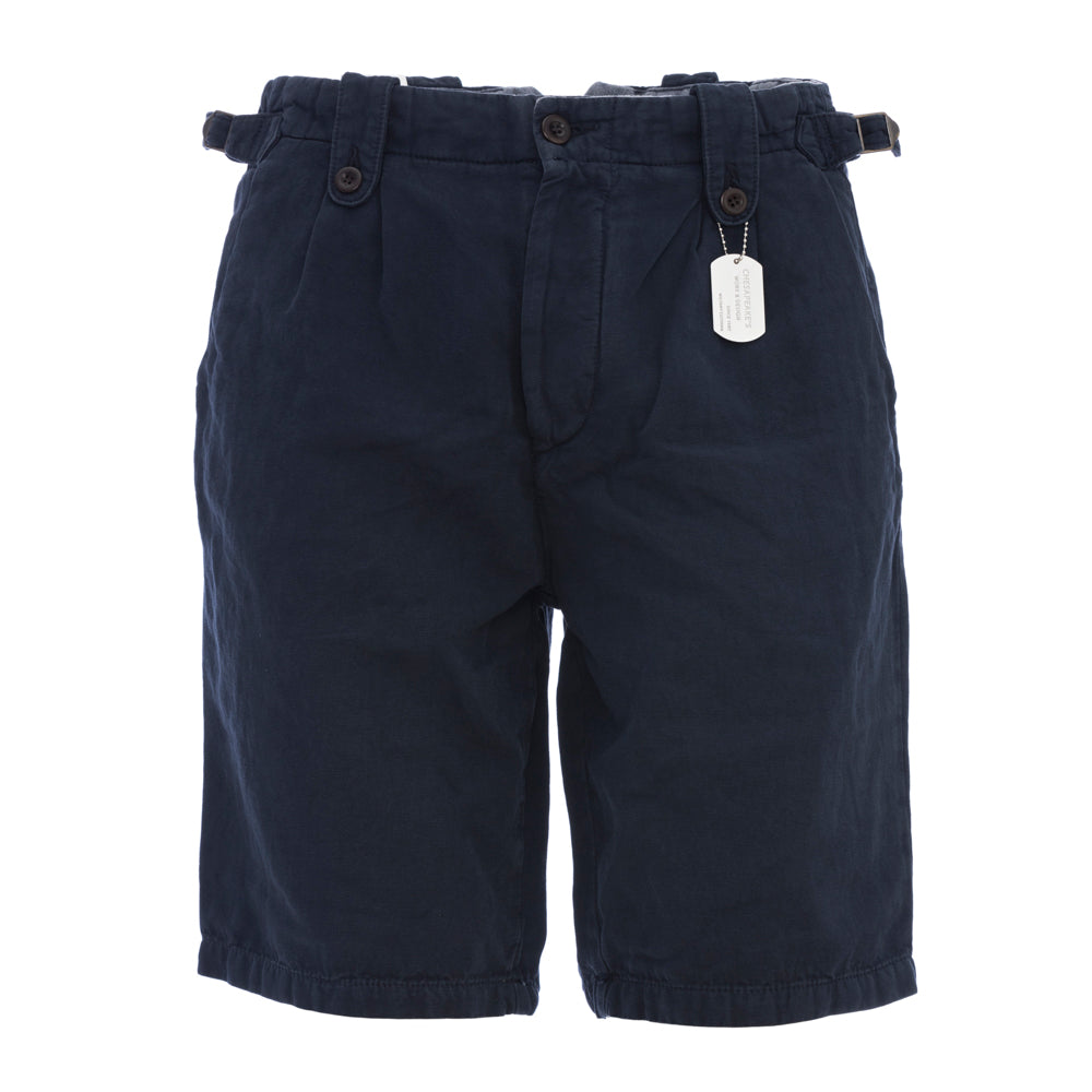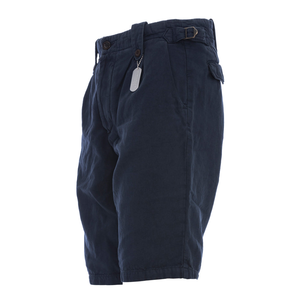 Cotton Bermuda shorts with front patch pockets, above-the-knee length. Two buttoned pockets on the back. Button closure.