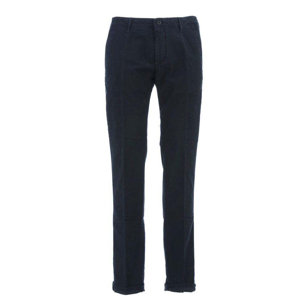 Stretch cotton trousers with zip closure, two front pockets and two rear double welt pockets without buttons, metal plaque with logo.