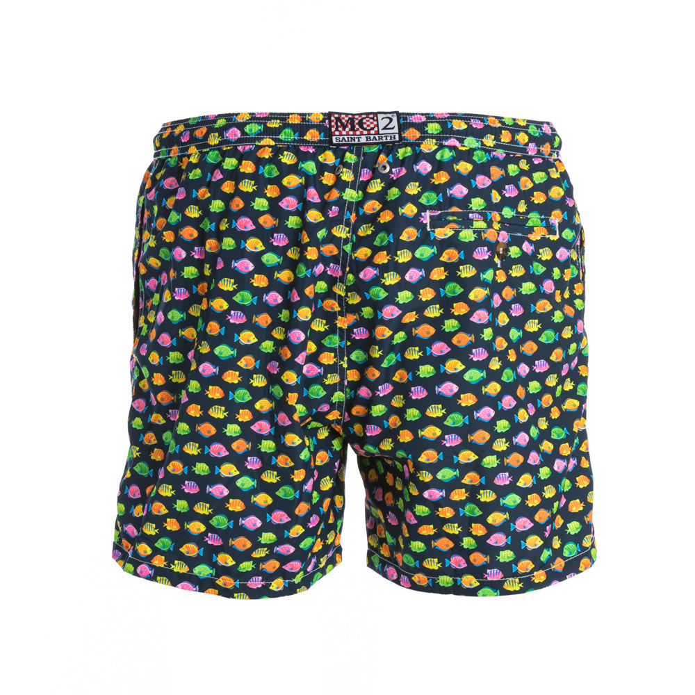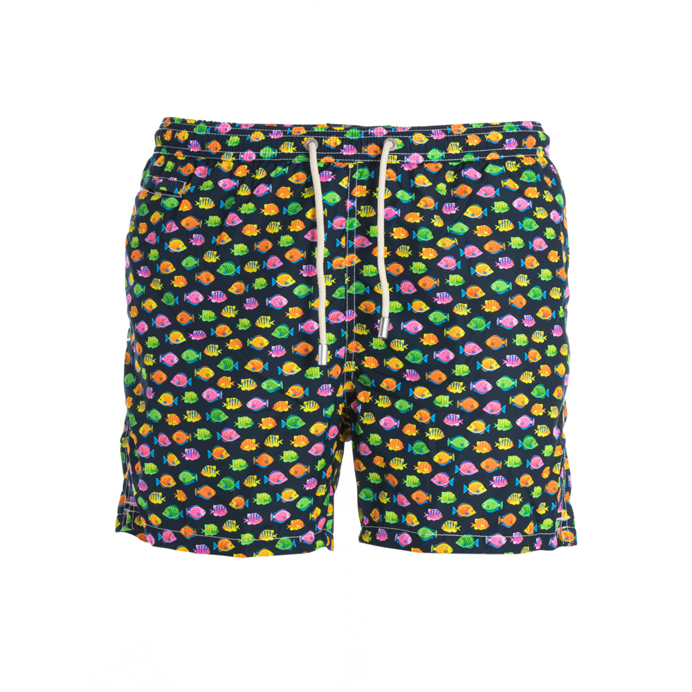 "LIGHTING" swimsuit, light and 100% recycled fabric. Blue base with fluorescent "FISH" micro-pattern. Medium length; ergonomic internal briefs. Drawstring closure; front pocket with velcro and back pocket with button. Small vents at the bottom of the swimsuit.