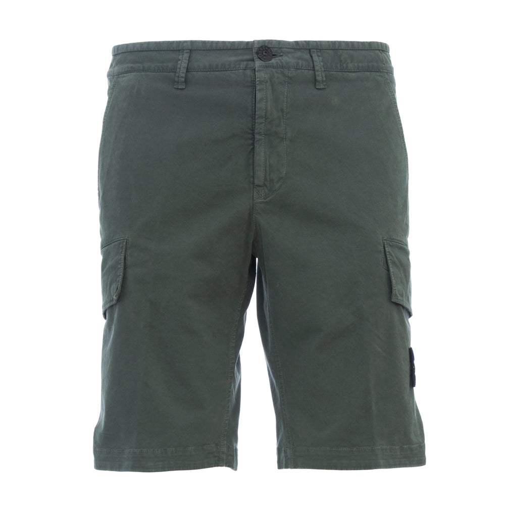 Bermuda cargo in fabric. Slim fit. Flush pocket with hidden zip. A pocket with hidden snap on the back. Pleated pockets on the legs, closed with flap and snaps; badge Stone Island on the left pocket. Reinforced seat. Zip and button closure.