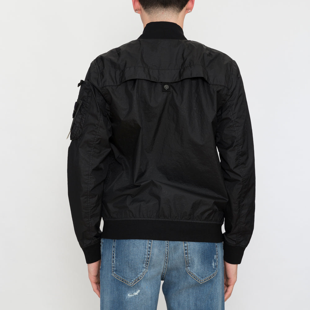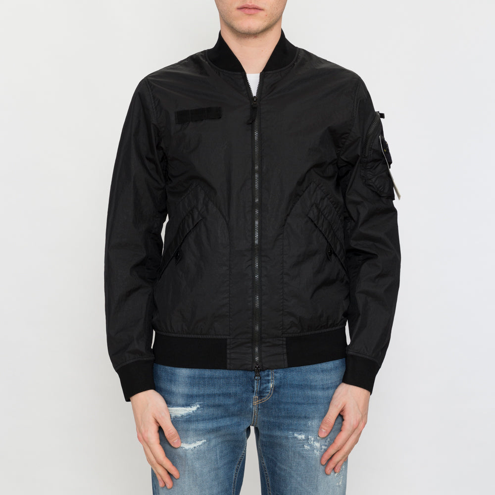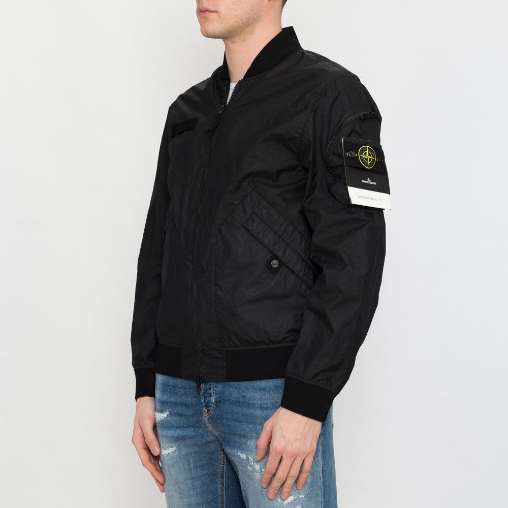 Bomber in 3L TC Membrane, a lightweight three-layer technical fabric made with a matte nylon outer surface laminated onto a breathable and water-resistant membrane, protected by an imperceptible polyester base. The experience of Stone Island in garment dyeing gives the outer part an exceptional color while preserving the performance characteristics of the inner membrane. Thanks to the addition of a special agent to the dyeing formula, the garment proves to be water-repellent. Ribbed collar. Nylon tape applied with loops on the chest. Diagonal pockets with snap button on tape. Rounded pleated pocket with zip closure and Stone Island badge on the left sleeve. Back vent with snap button on tape. Ribbed cuffs and lower band. Double-slider zip closure.