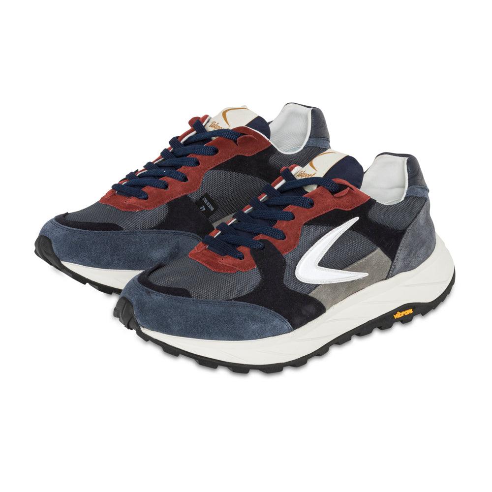Upper in a combination of suede, nappa, mesh and reflex, strobel processing, heat-sealed boomerang, Vibram sole, calf lining and cotton laces.