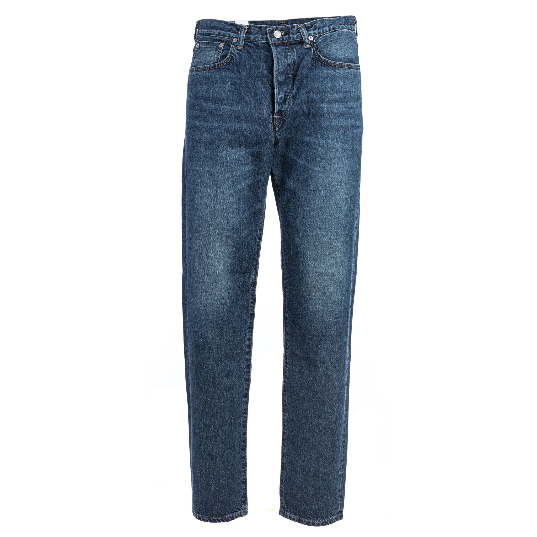 Collection "Fabriqué au Japon". Les jeans fuselés réguliers sont fabriqués avec un tissu denim selvedge arc-en-ciel Nihon Menpu de 13,5 oz, Dark Pure Indigo Rainbow. Lavage moyen foncé. 5 poches, fermeture bouton griffée. Boucle au dos en cuir clair. Petite étiquette sur la poche arrière droite. Toile denim ferme.