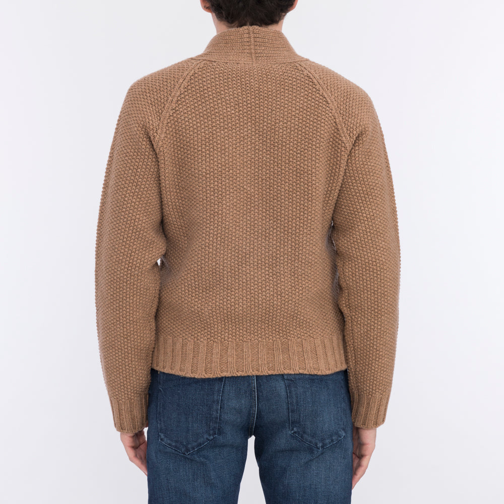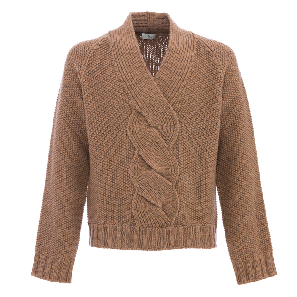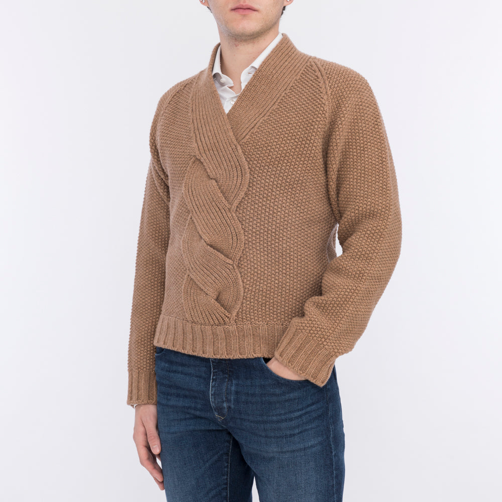 Le pull est réalisé en pure laine, caractérisé par un design unique avec une broderie tressée particulière sur le devant et un décolleté en V. Il présente des manches longues raglan, des poignets et un ourlet côtelés, ce qui en fait un vêtement élégant et accueillant, parfait pour toute occasion. .