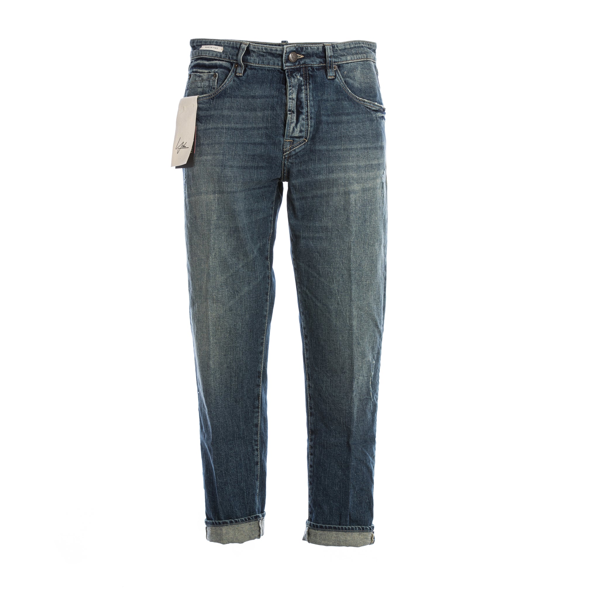 Jean oversize en délavage thé. Toile denim 100 % fabriquée en Italie ; fermeture à bouton griffé. Il y a deux petites "déchirures" sur le devant du jean qui en font une pièce vintage. Poches arrière légèrement tombantes ; à hauteur de la poche arrière droite 4 "dots" qui caractérisent la marque Ychai. Vie normale; tissu légèrement extensible.