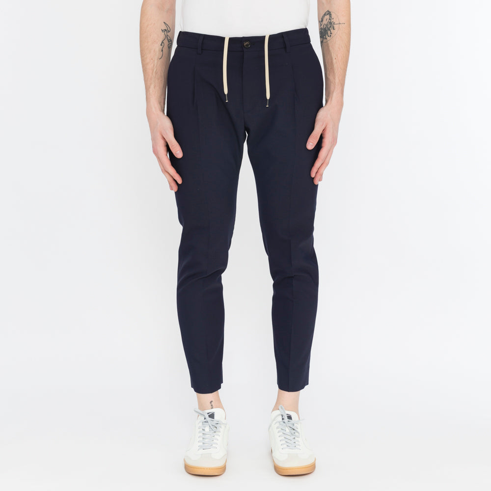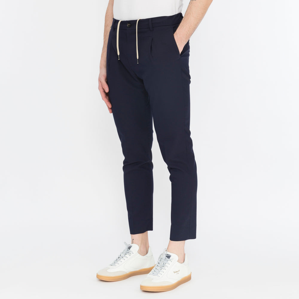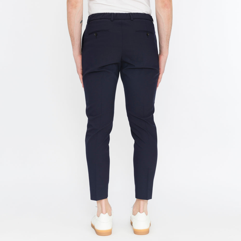 Pantalone modello Riccardo con girovita elasticizzato sul retro, chiusura frontale con bottone e zip a scomparsa, due tasche frontali, due tasche a filetto sul retro con chiusura a bottone, pences frontali.