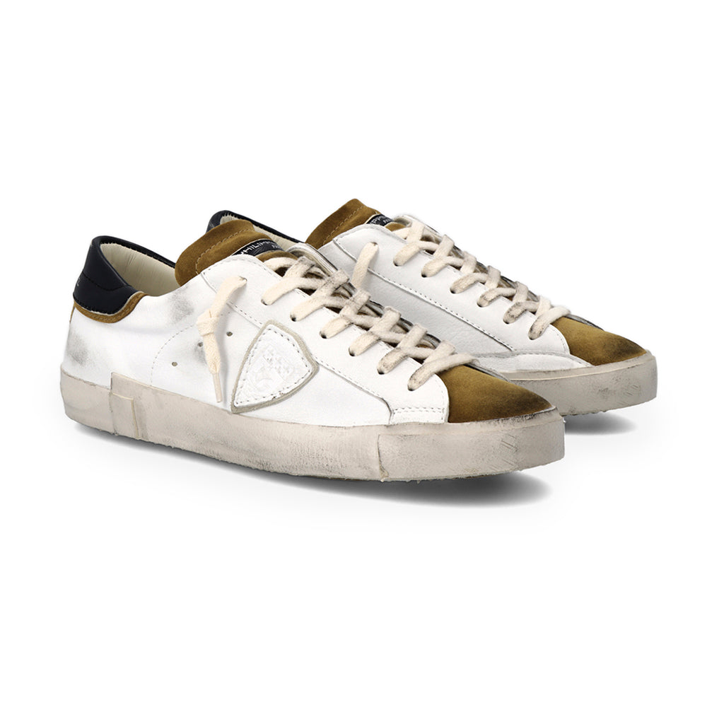 Sneaker bassa in suede e vitello lavato, con trattamento used. Topponcino e bordo dello scudetto in pelle a contrasto. Foderata internamente in pelle, è completata da fussbett estraibile in schiuma rifinito in vitello e fasciatura artigianale spazzolata per un effetto used.