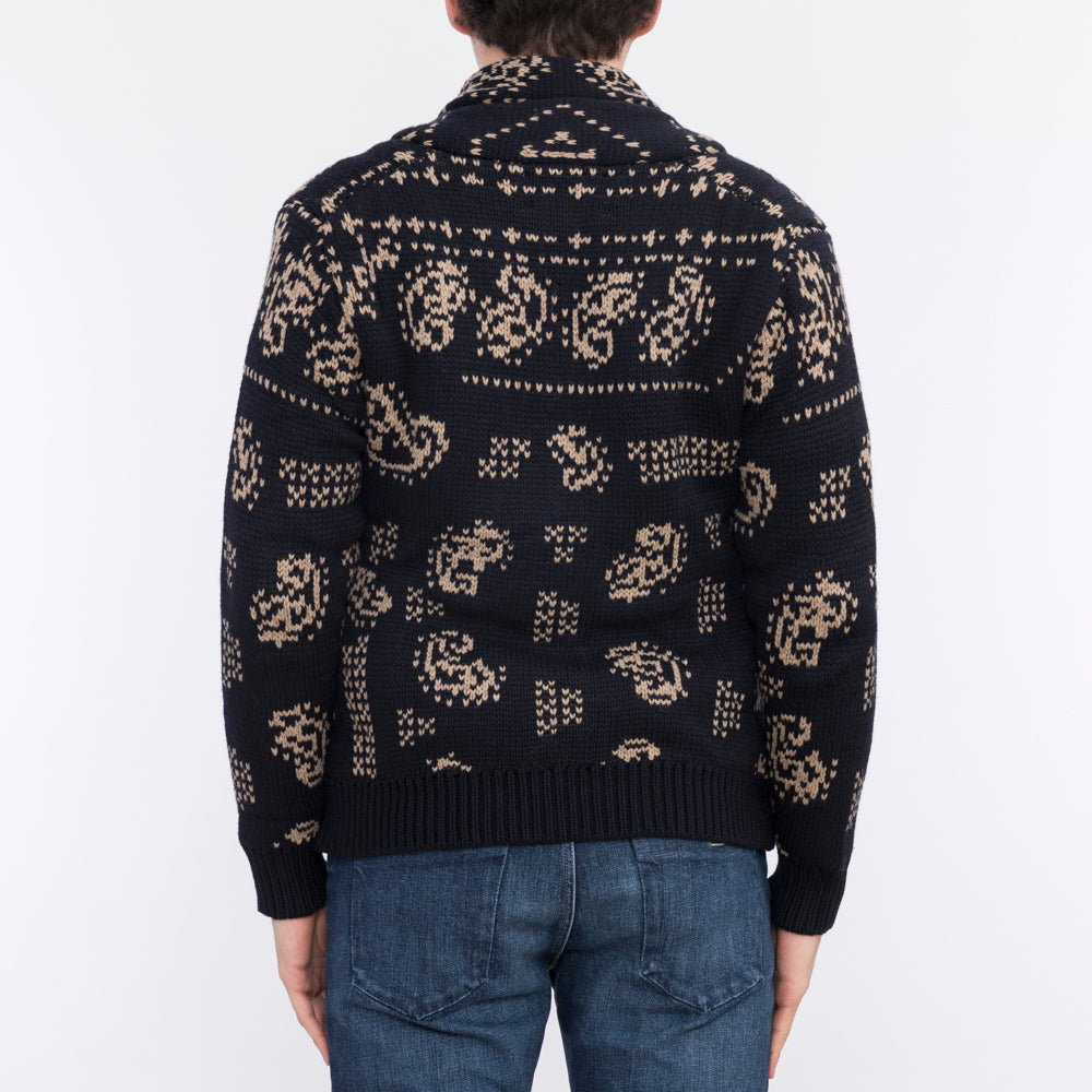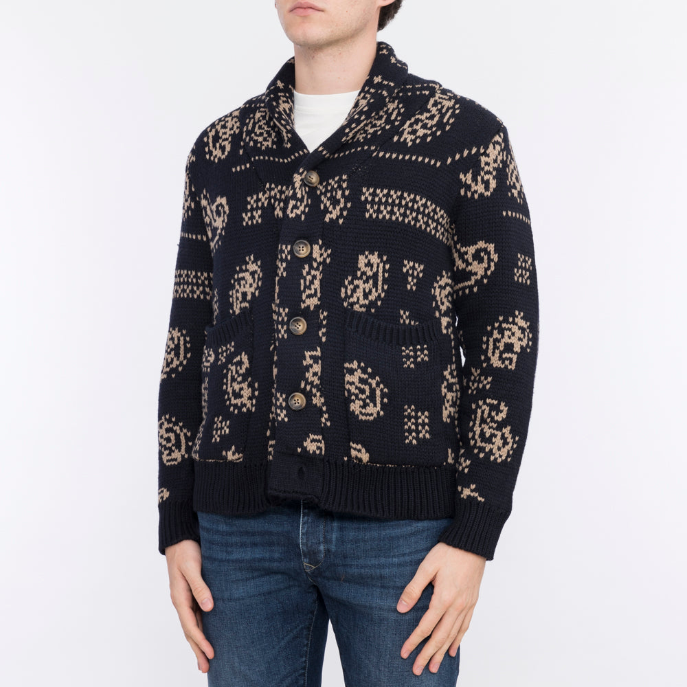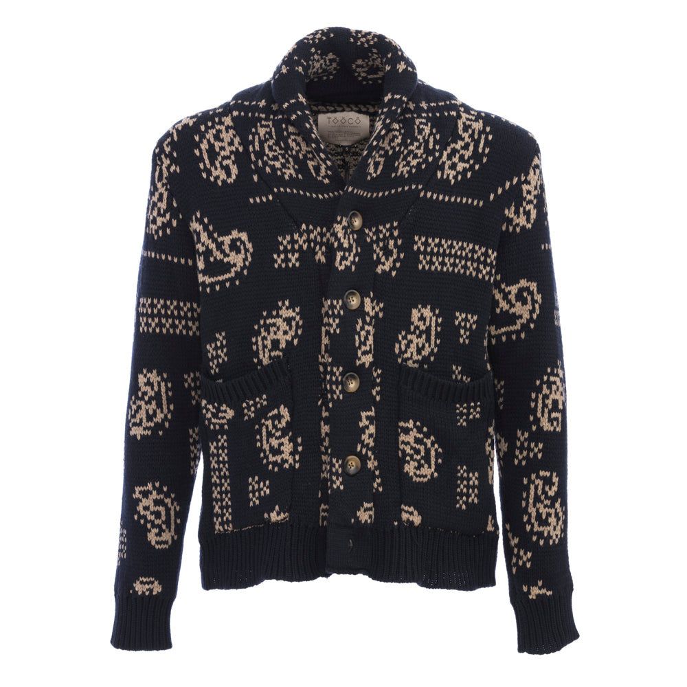 Cardigan caldo, confortevole con chiusura con bottoni e scollo a V. Realizzato in misot lana e cashmere e decorato con fantasia etnica.